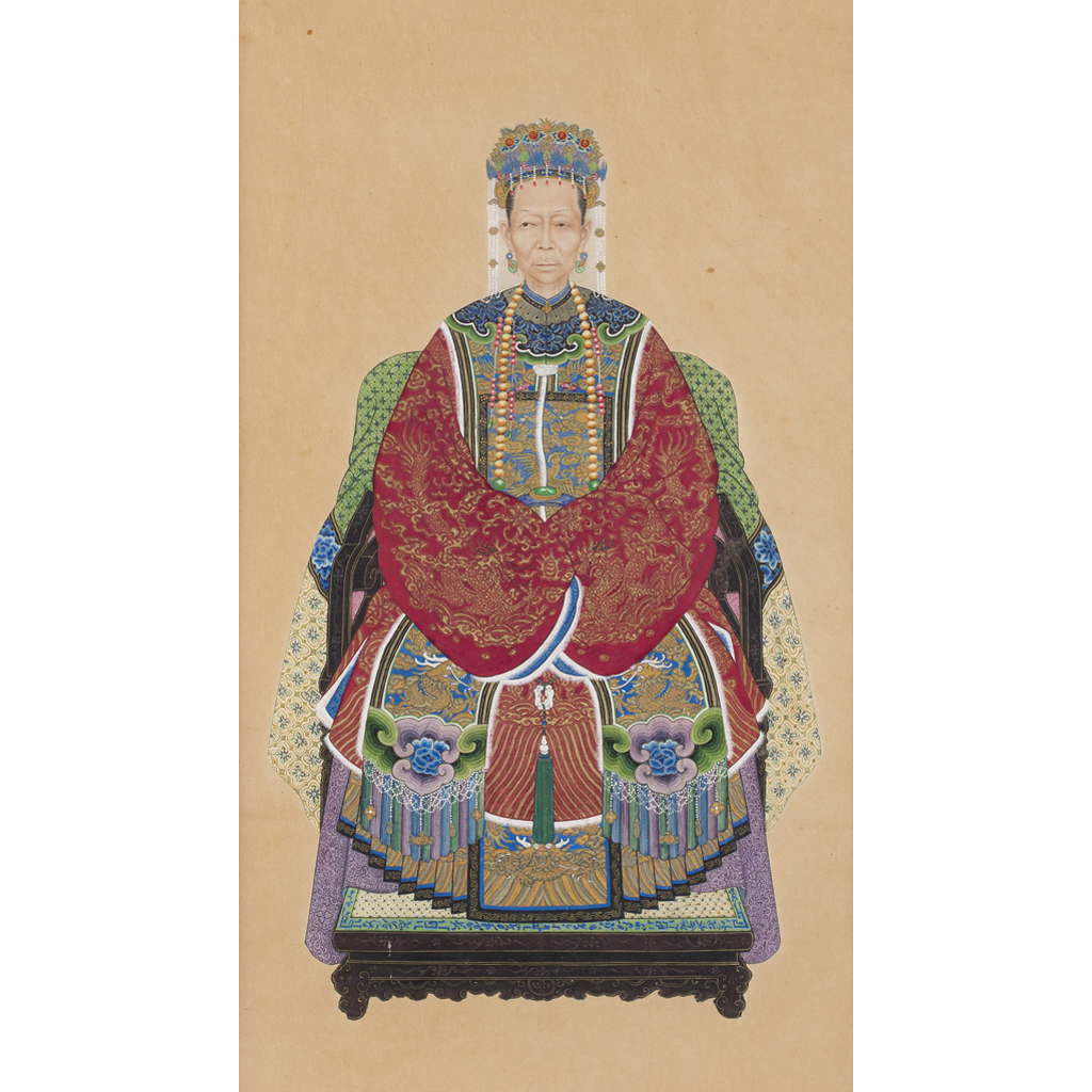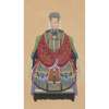 depicting an elderly lady seated on a chair draped in silks, wearing a robe richly embroidered in gilt and multicoloured designs, with headdress and ceremonial jewellery, framed