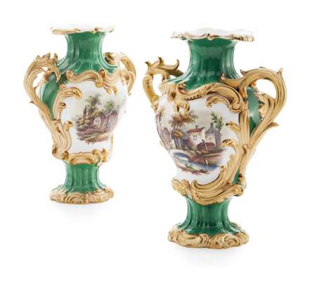 each modelled in the rococo style, of baluster form with a flared neck and scrolled twin handles, painted with buildings within landscape settings, on a green ground with cream and gilt highlights (2)