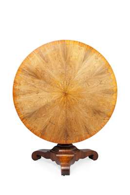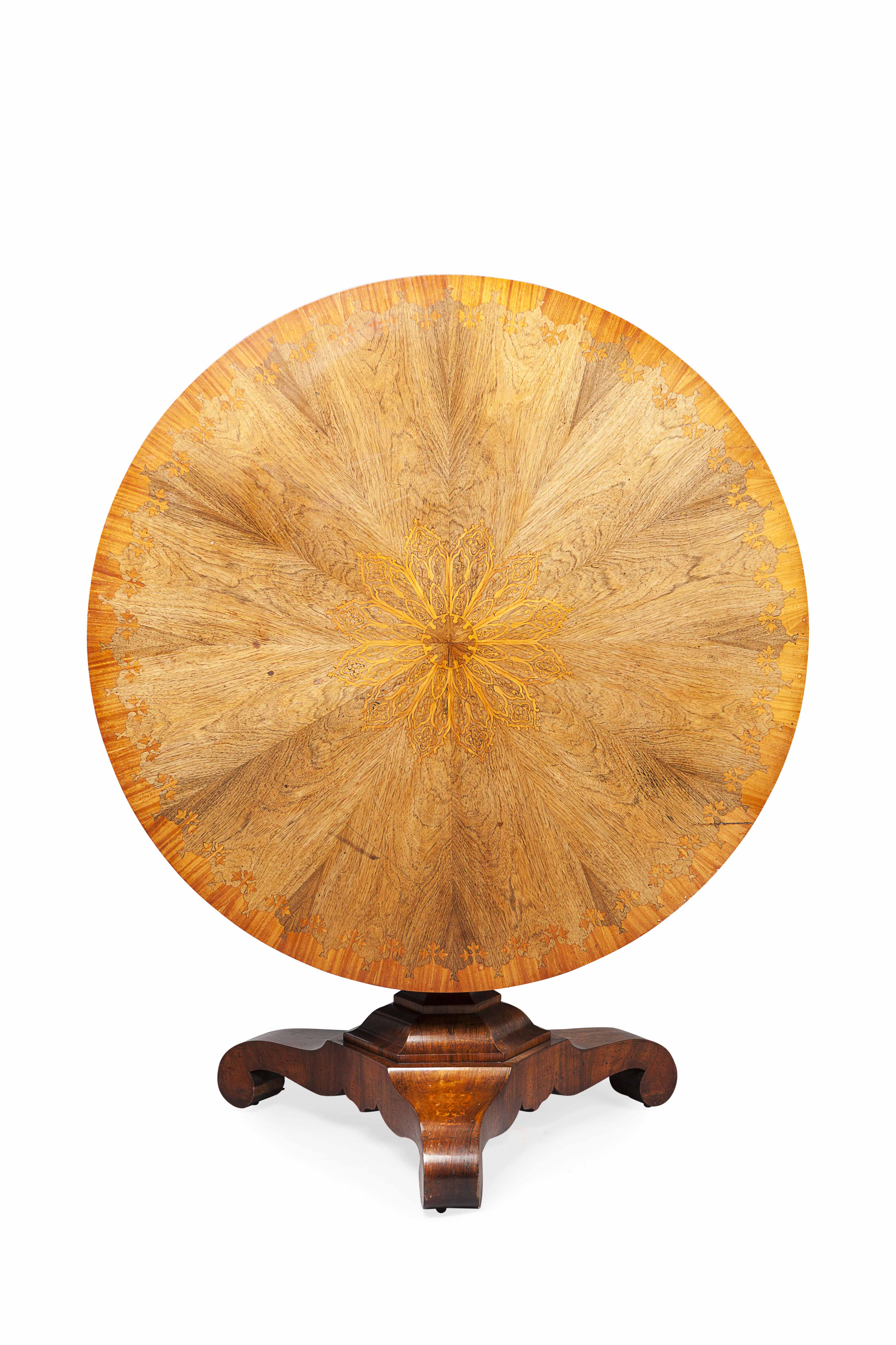 the circular tilt top with radiating veneers inlaid with stylised foliate medallion and border, above a robust facetted support on a triform base with scrolled feet raised on castors