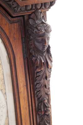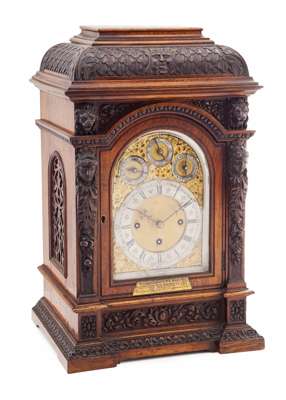 the ogee pediment carved with a central mask motif and acanthus leaf moulding, above the silvered and gilt dial, subsidiary dials and inscribed presentation plaque, flanked by lion and mask spandrels, raised on a carved base, the movement striking on a gong
