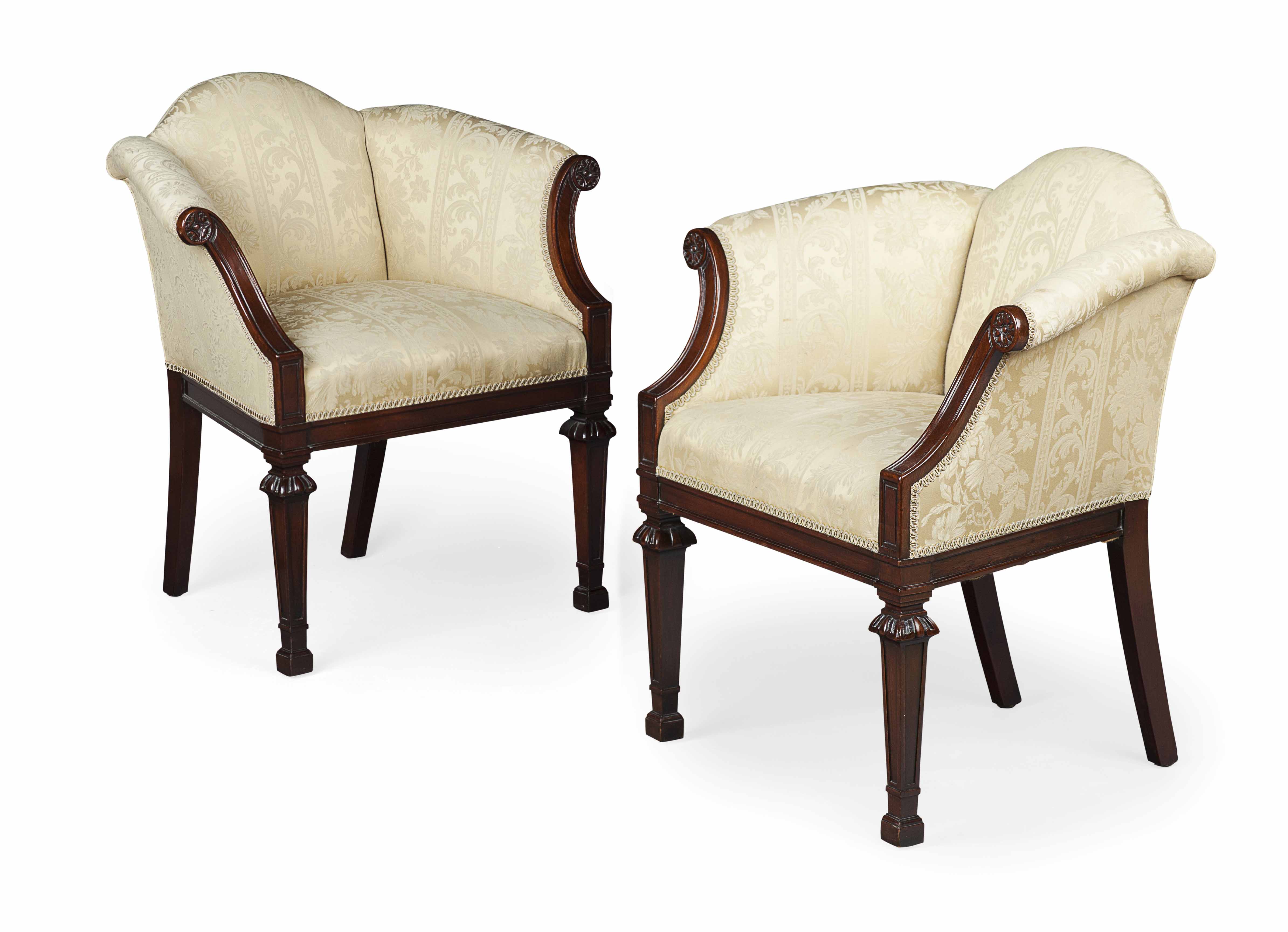the arched padded backs and arms above a stuff over seat, in yellow damask upholstery, raised on square tapered legs ending in block feet (2)