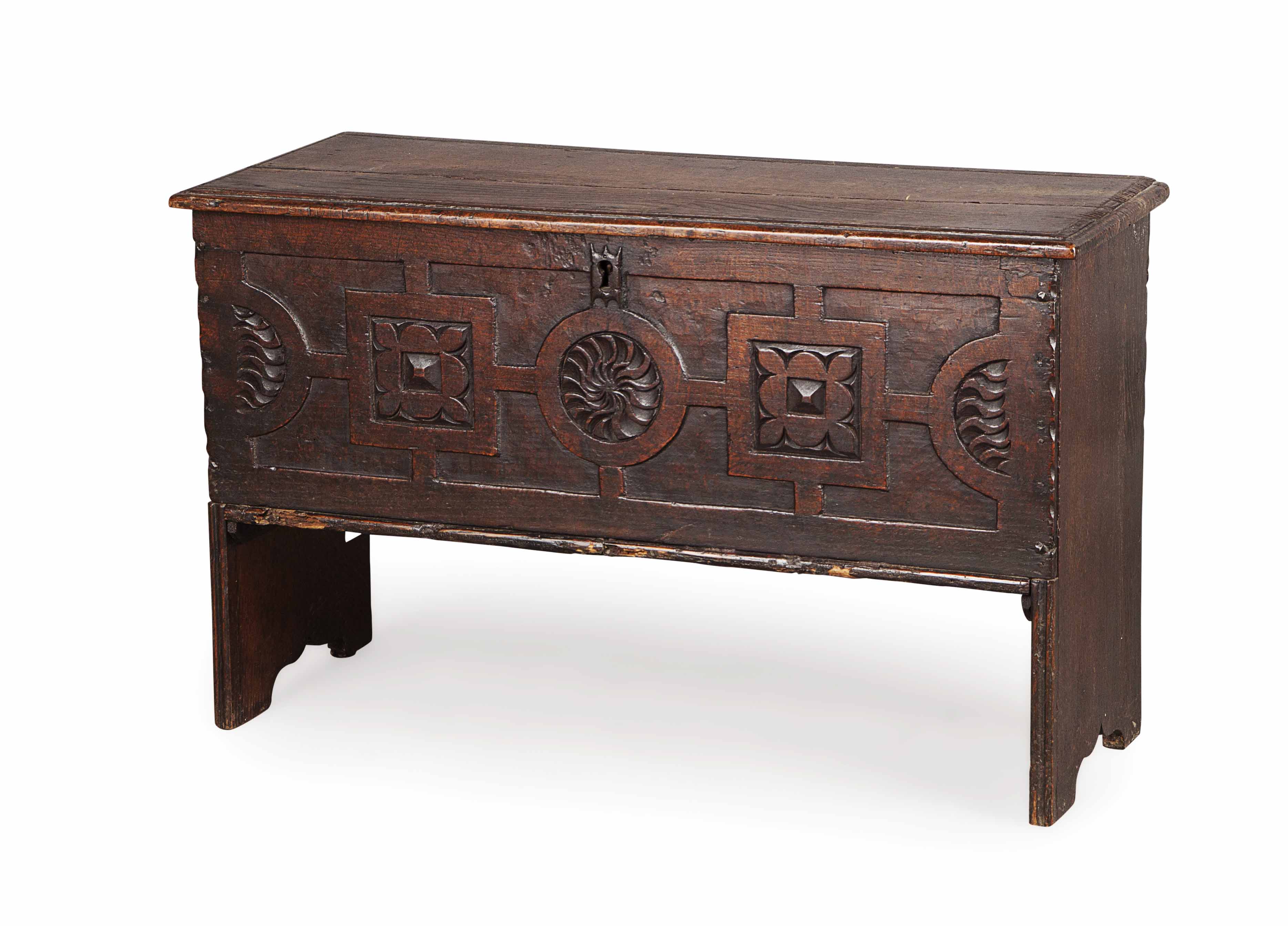 the moulded hinged lid opening to a void interior, above a geometric and stylised foliate carved front, raised on shaped end supports