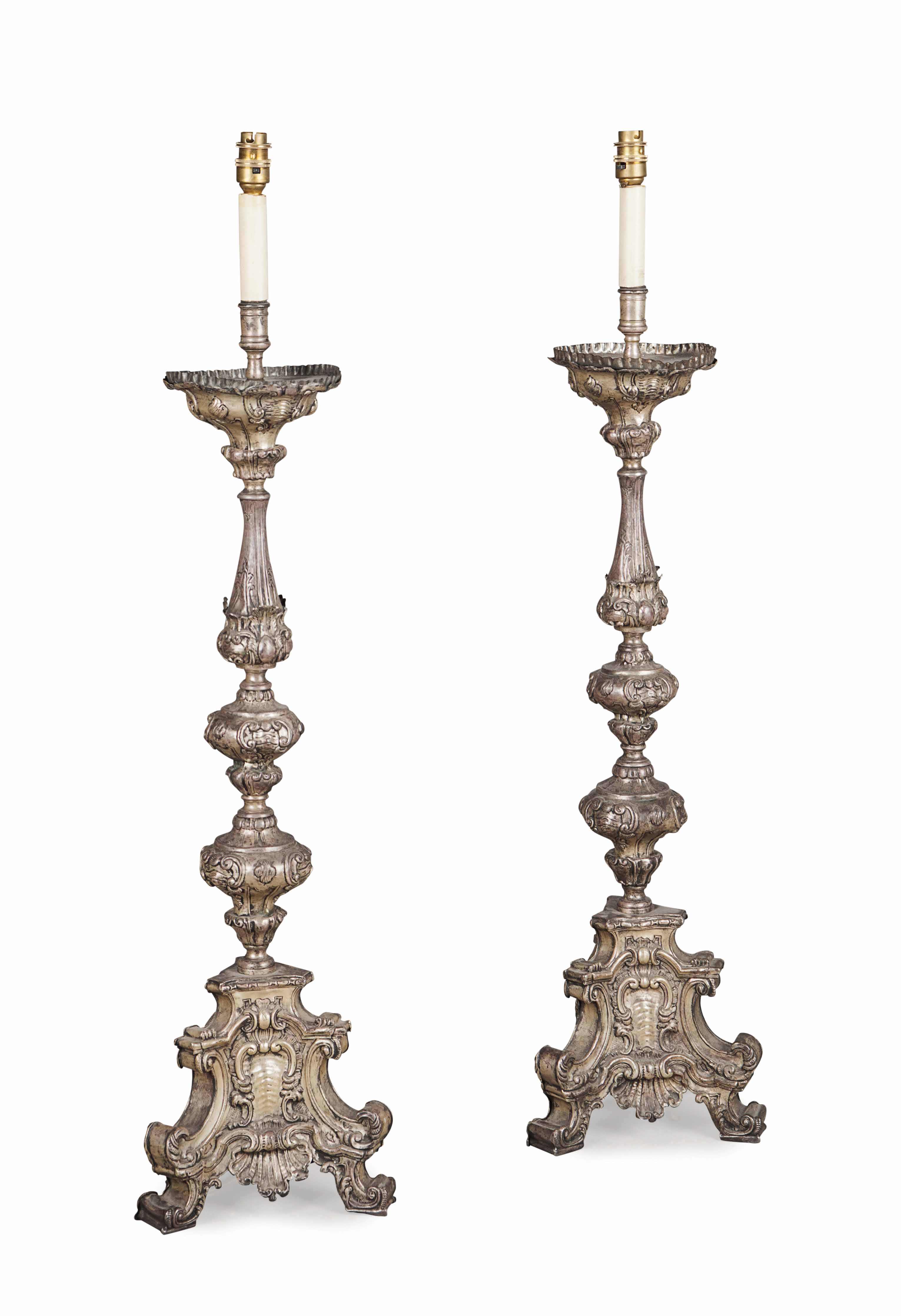 converted to lamps; in the Baroque style, raised on triform bases (2)