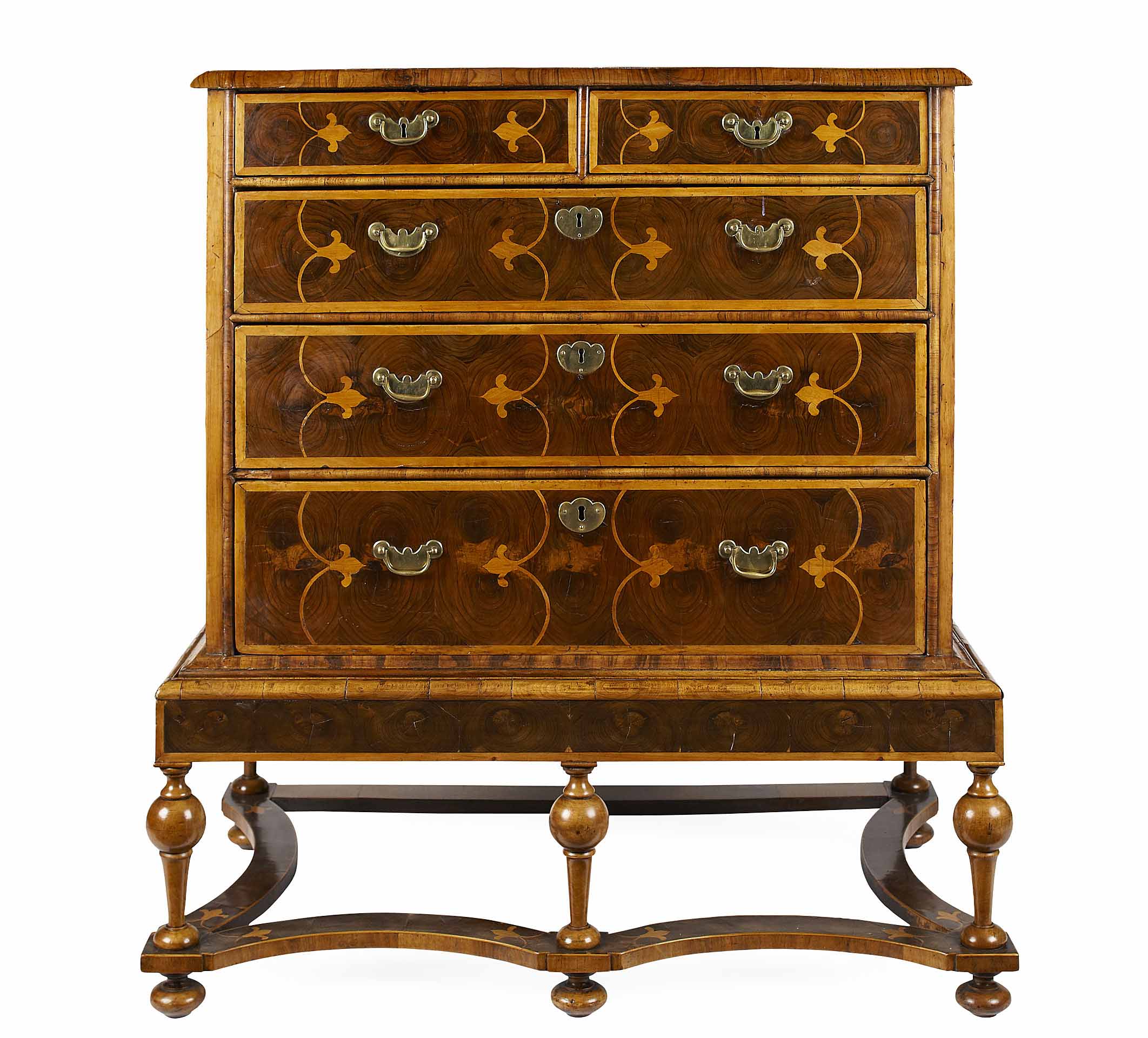 WILLIAM & MARY LABURNUM AND WALNUT OYSTER VENEERED CHEST ON STAND