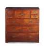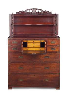 the hinged top opening to shelves and a scroll carved crested back, above a central fall front drawer fitted with a leather writing surface, pigeon holes and drawers, flanked by banks of two short drawers, above three further long graduated drawers, raised on short block feet; one drawer stamped ' E. ROSS / Camp Furniture / Manufacturer / 9.TO.11 / Elliss Quay / DUBLIN'