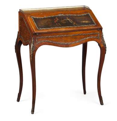 the three quarter pierced gallery top over a slant front with a Vernis Martin panel of a courting couple, opening to small drawers, pigeon holes and covered recess, raised on slender square cabriole legs, with gilt metal mounts