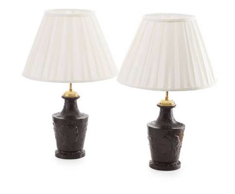 converted to electricity, of urn form cast in two parts with a Greek-key border, profiles of classical females, and scrolling leafy branches, with cream pleated silk shades (2)