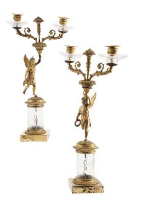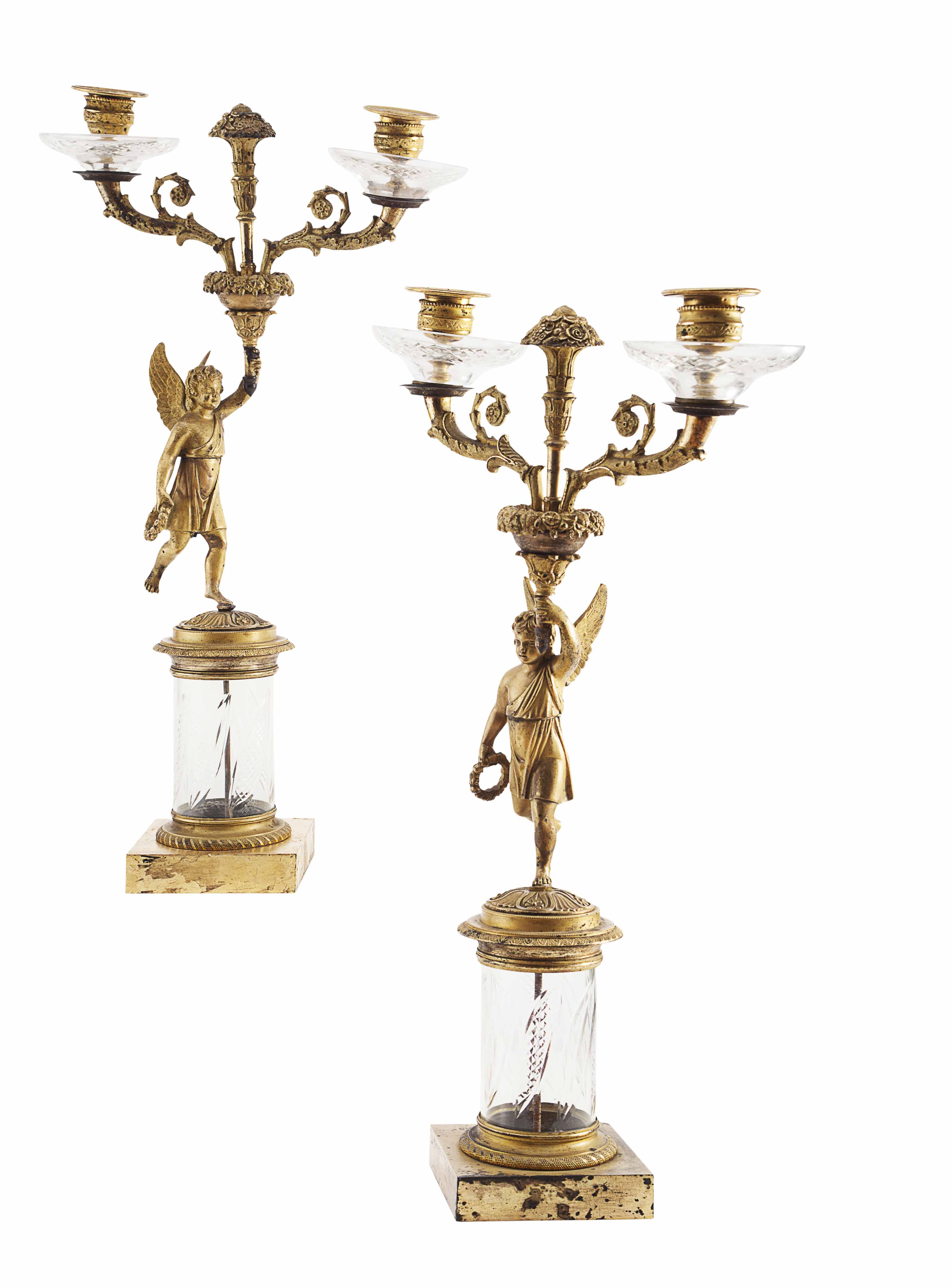 PAIR OF FRENCH EMPIRE GILT BRONZE AND CUT GLASS CANDELABRA