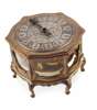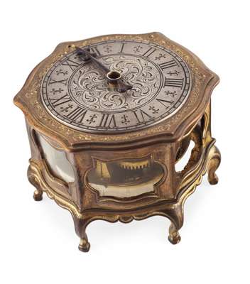 the engraved silvered dial with Roman numerals and set in a shaped hexagonal case with open sides and raised on six cabriole legs, the works engraved 'DVPRE A PARIS'