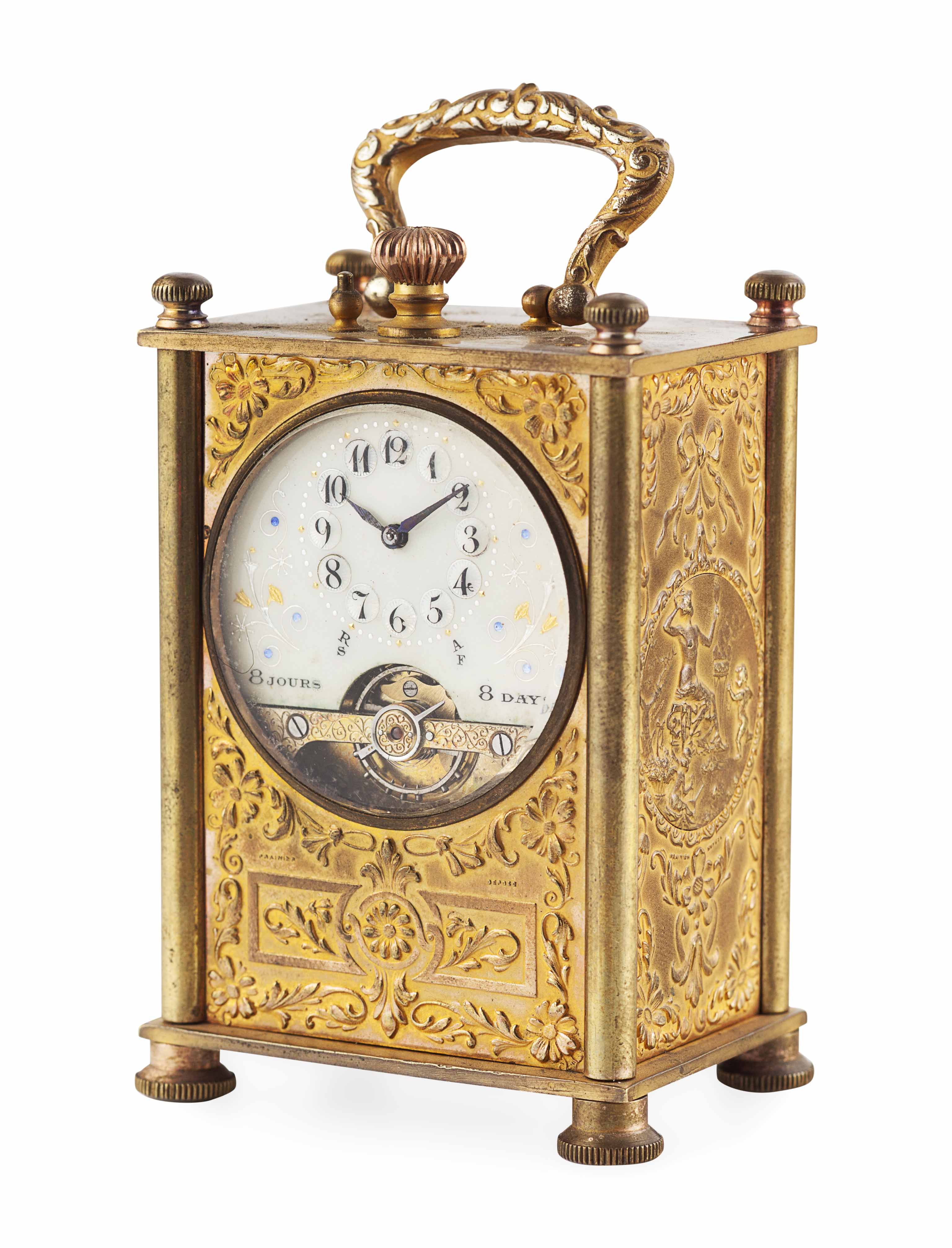 the three-quarter white enamel dial with Arabic numerals, floral motifs and inscribed '8 JOURS' and '8 DAYS', set in a mask embossed with foliate motifs, the sides and back panels with circular figural reserves, floral garlands and ribbons, all marked 'Frainier, Depose'