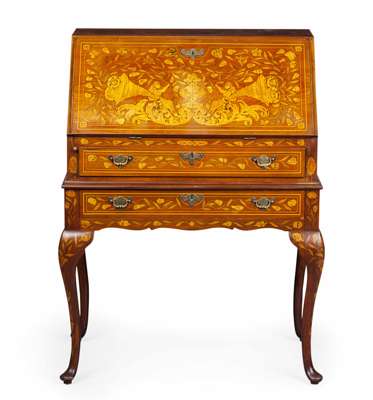 in two parts, the slant front over a long frieze drawer; the lower part with a long drawer and raised on cabriole legs ending on pad feet, with flowering cornucopia, figures, and urn marquetry throughout