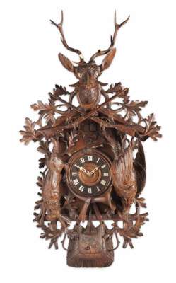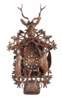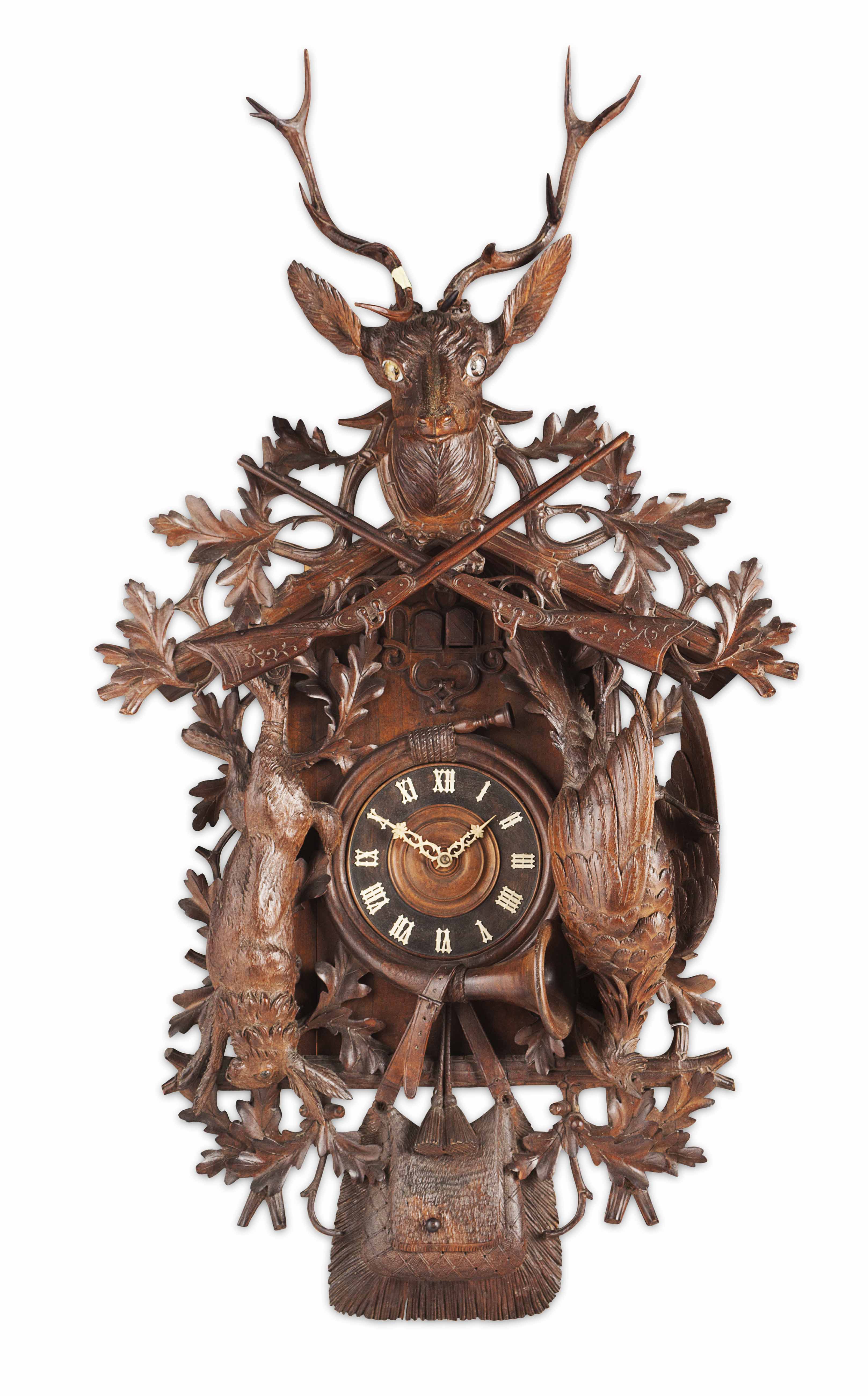 with a cresting carved with a stag's head with glass eyes and crossed rifles above a chalet-form case carved with oak leaves, a hare, pheasant, horn and huntsman's bag and fitted with a cuckoo bird mechanism above the dial