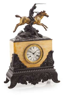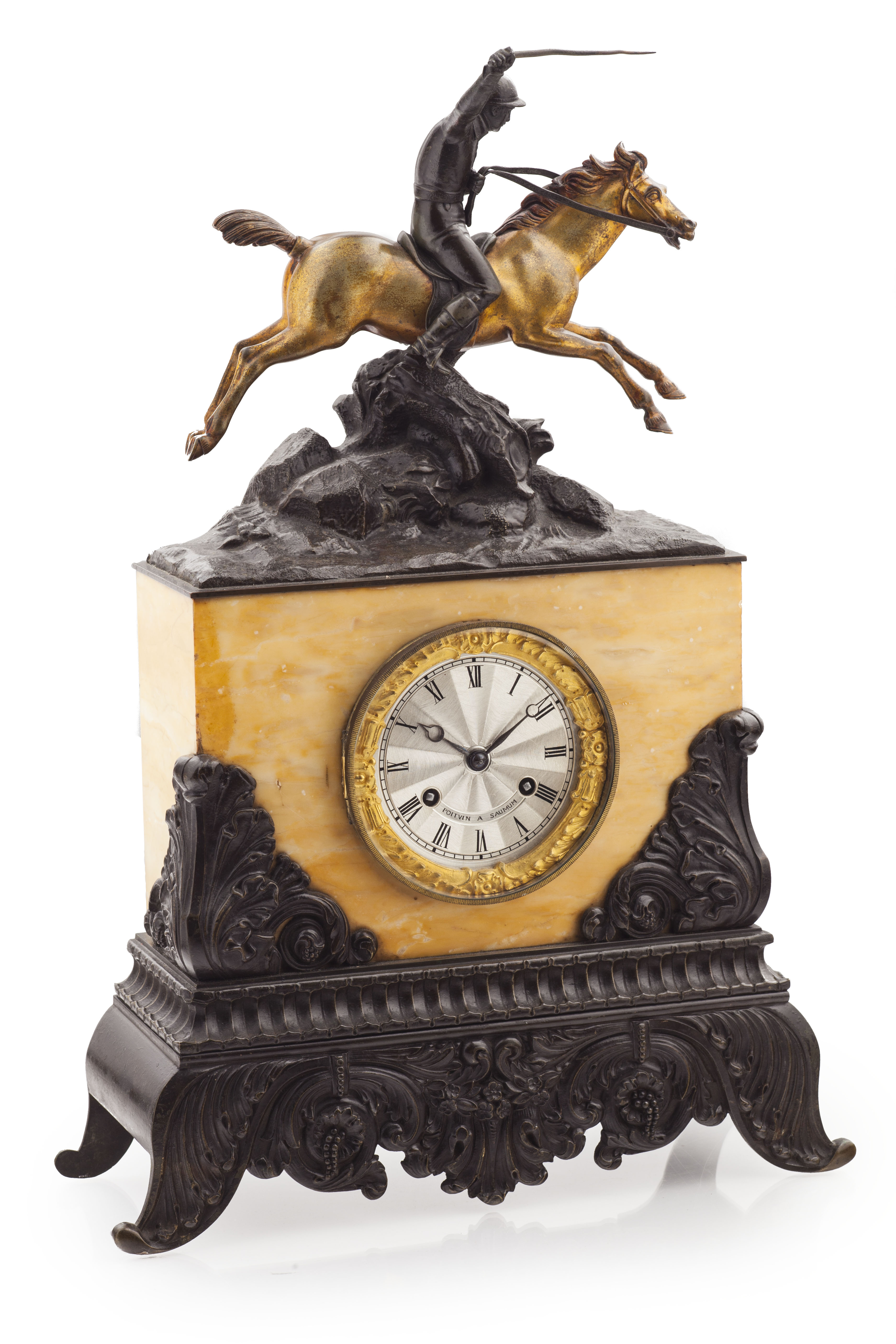 FRENCH GILT AND PATINATED BRONZE MARBLE MOUNTED MANTEL CLOCK, OF EQUESTRIAN INTEREST