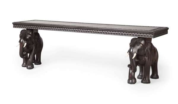 the long rectangular seat with a foliate carved border raised on a pair of carved elephant supports with ivory tusks