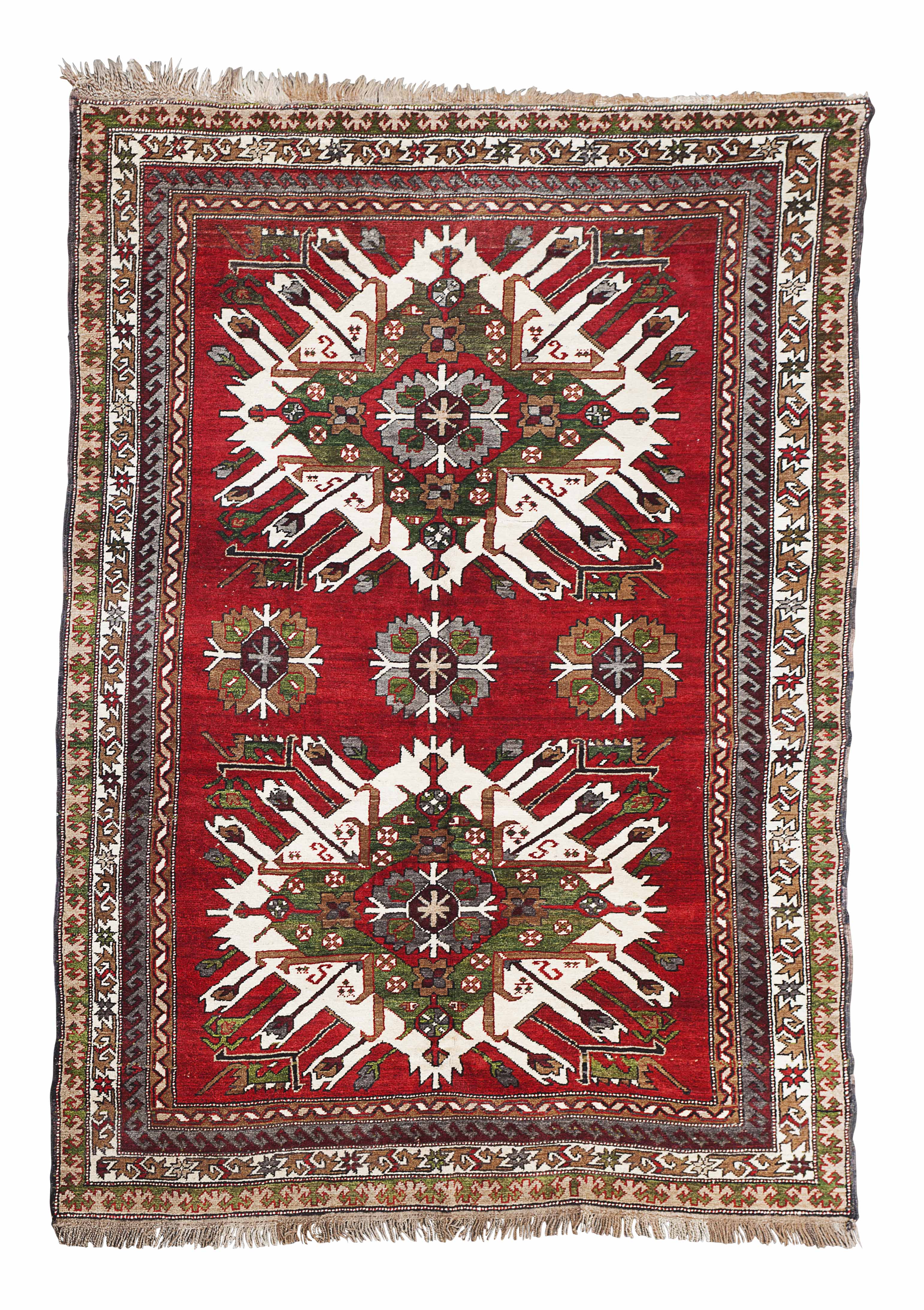 the red field with two cream and green 'eagle' lozenge medallions, within narrow cream stylised vine border between bands