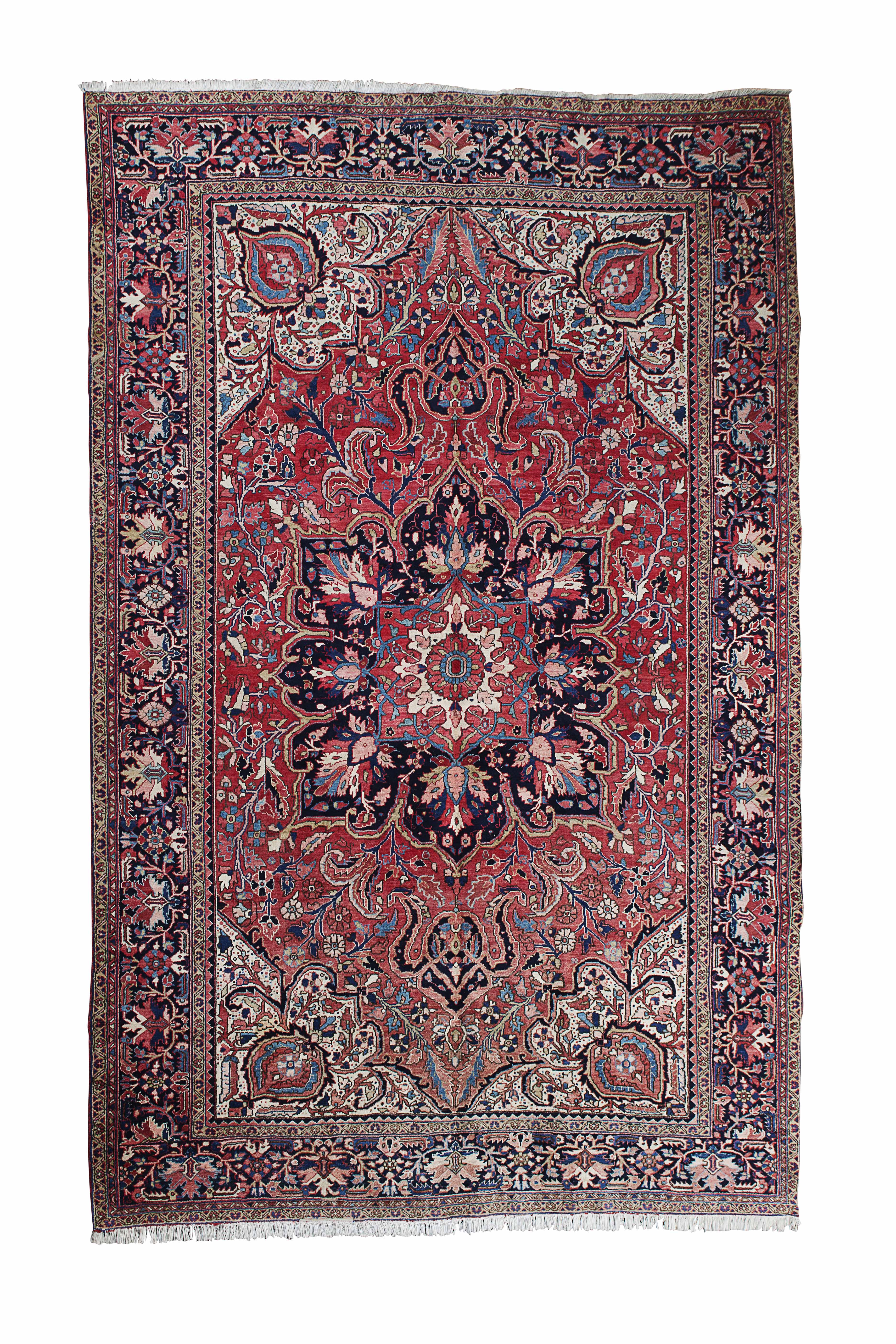 the red field with indigo medallion suspending pendants, cream spandrels, within indigo palmette and vine border between bands