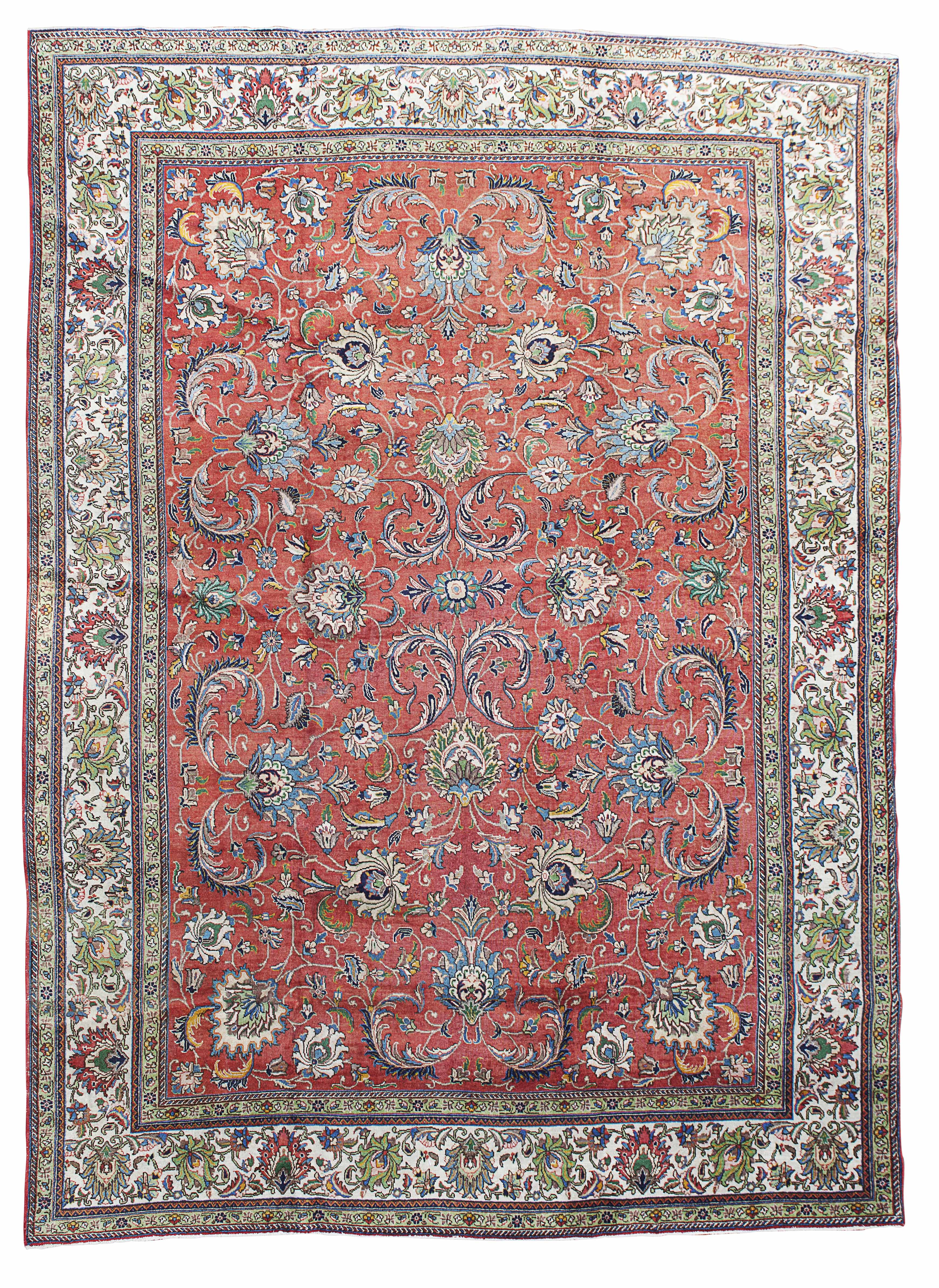 the red field with allover palmette and foliate vine pattern, within cream palmette and vine border between bands