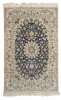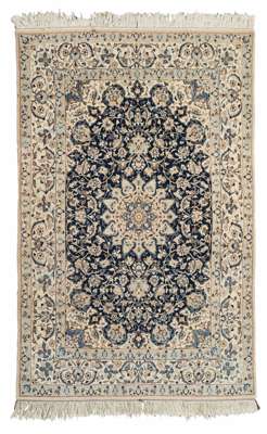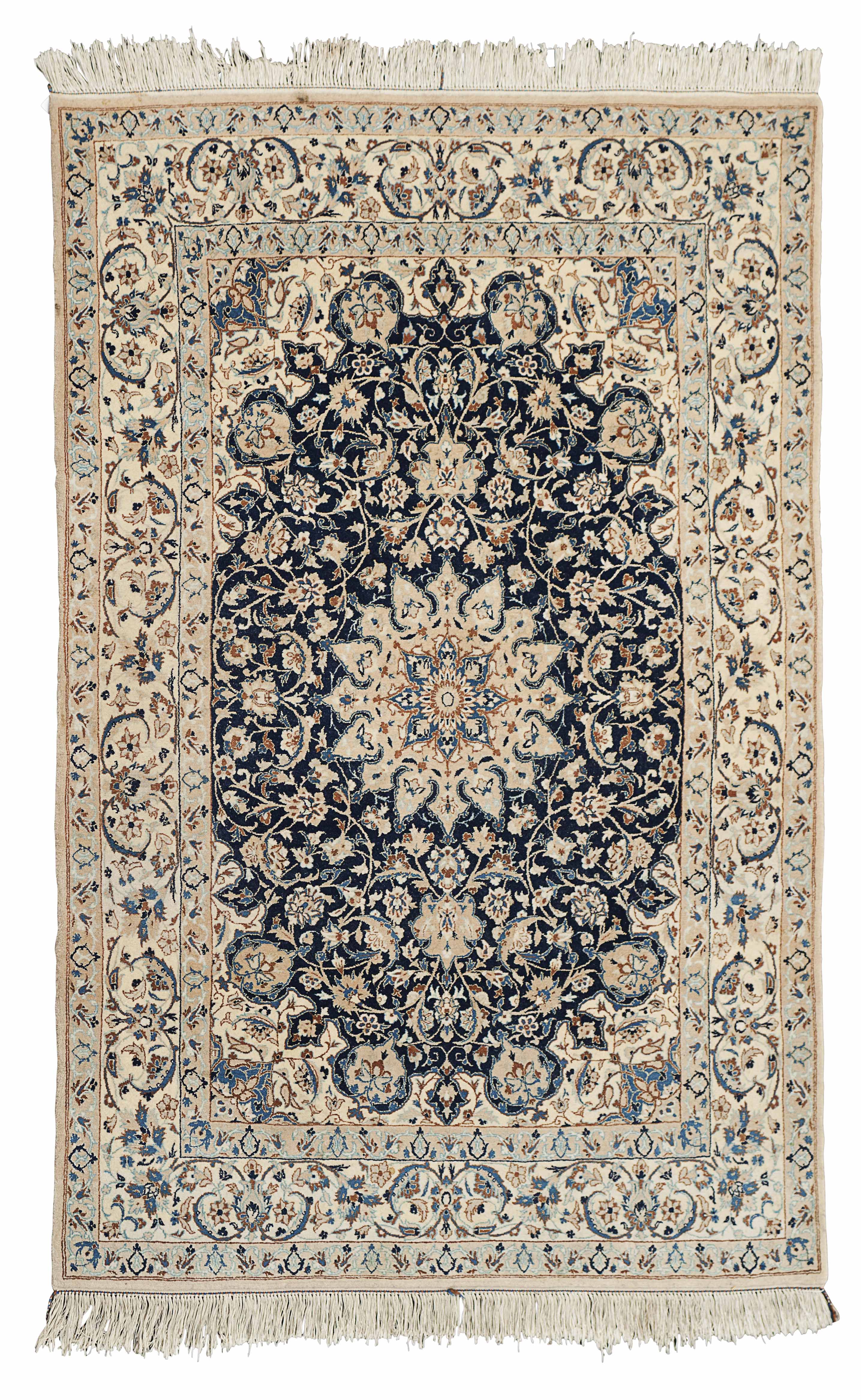 the indigo field with cream medallion, similar spandrels, within cream border between bands