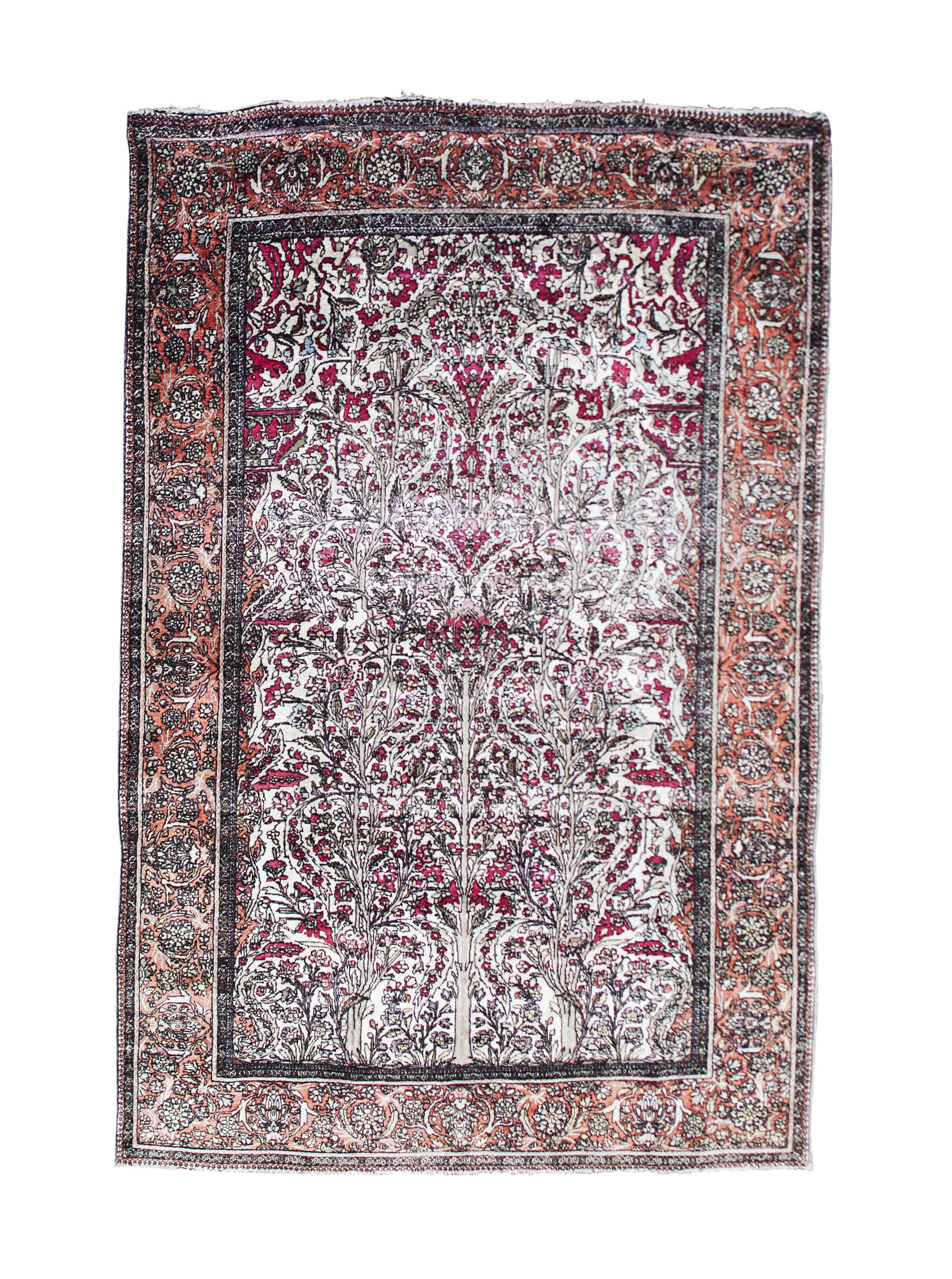 the ivory field with dense foliate tree pattern, within brick red palmette, rosette and arabesque vine border between bands