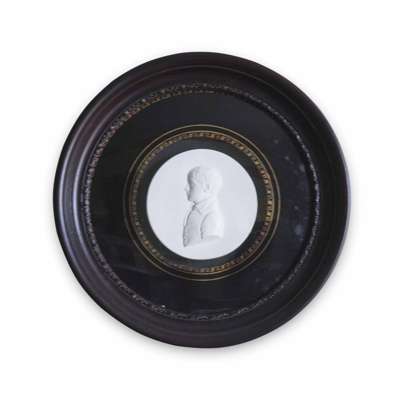 both circular, the first depicting a profile portrait of Byron, in a circular moulded frame, 28cm diameter overall; the other a profile portrait of a gentleman, in a circular moulded frame, 25cm diameter overall (2)