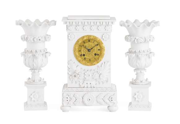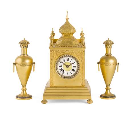 FRENCH GILT AND SILVERED METAL THREE PIECE CLOCK GARNITURE