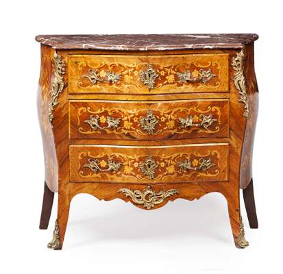 LOUIS XV STYLE SERPENTINE AND BOMBE KINGWOOD AND FRUITWOOD MARQUETRY MARBLE TOPPED COMMODE