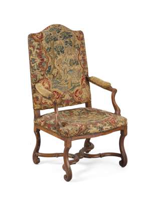 FRENCH BEECH AND TAPESTRY UPHOLSTERED ARMCHAIR
