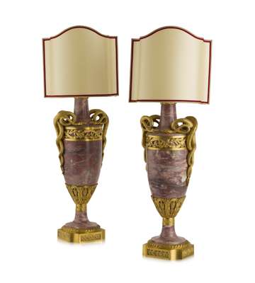 PAIR OF FRENCH PINK MARBLE AND ORMOLU LAMPS