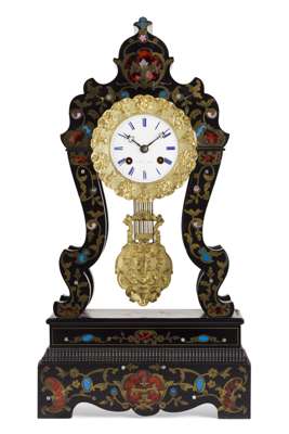 FRENCH EBONISED AND INLAID PORTICO CLOCK, SIGNED LAINE A PARIS