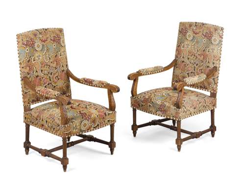 PAIR OF FRENCH NEEDLEWORK UPHOLSTERED BEECH ARMCHAIRS