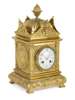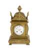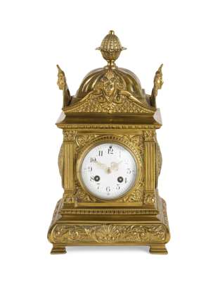 the pineapple gilt metal finial above a domed fluted pediment and mask spandrels, the square case with a white enamelled dial with Arabic numerals, raised on stepped bracket feet, the eight day movement striking on a gong