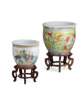 the first of typical form with an everted rim, decorated with peaches, bats, and prunus, on a yellow ground, raised on a hardwood stand; the other, painted with figures amongst trees and clouds and an inscription, raised on a hardwood stand (2)
