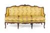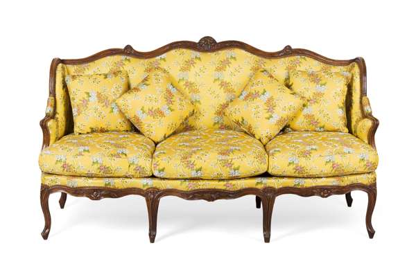 covered in gold foliate fabric, the carved scrolled top rail and enclosed downswept arms with part pads, above a triple cushion seat raised on cabriole legs