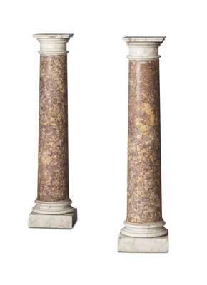 the square white veined marble tops over plain columns on moulded square bases (2)