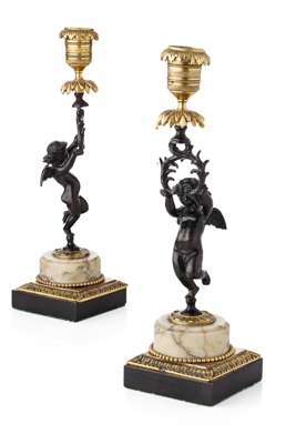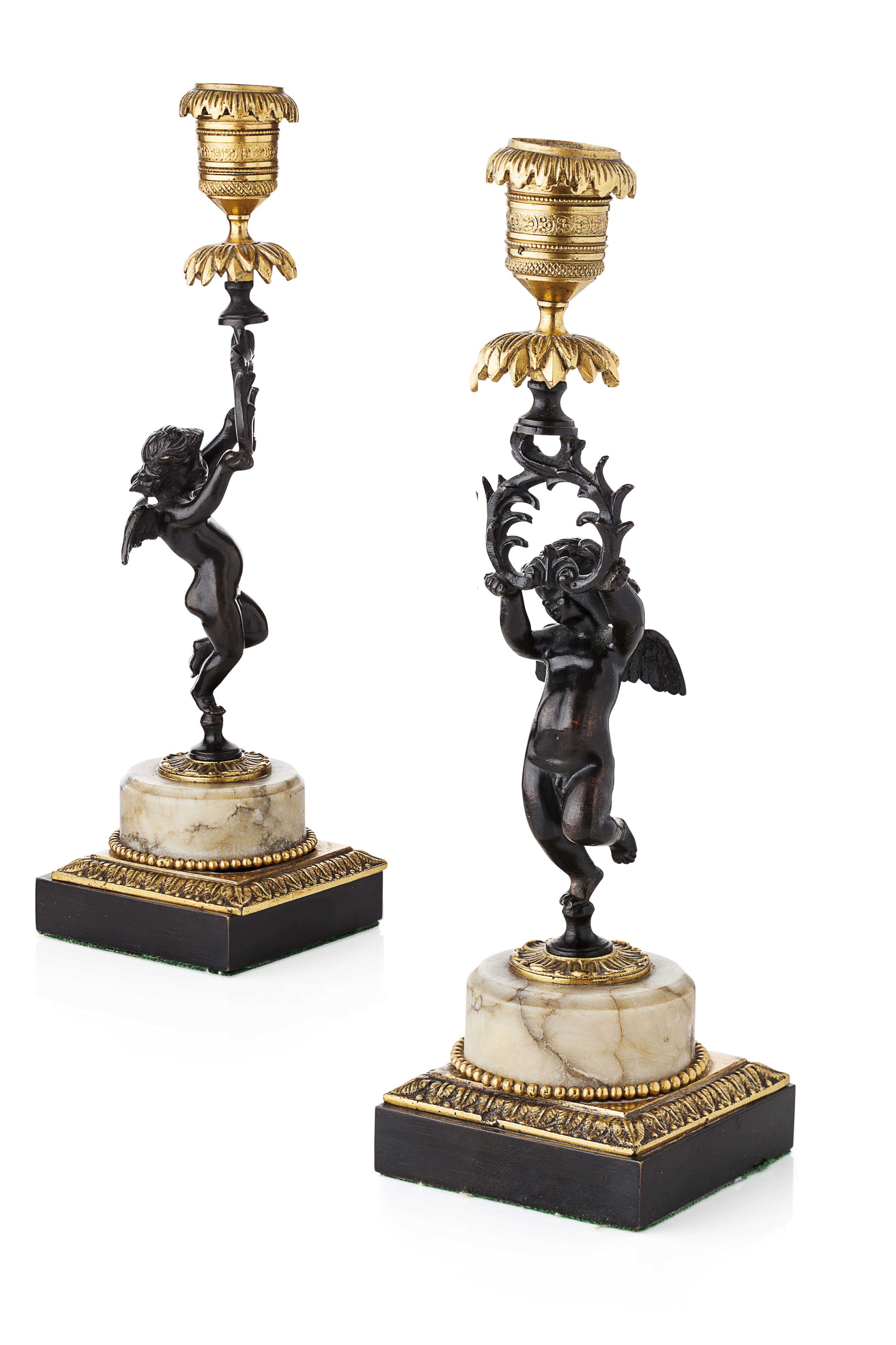 each with a putto supporting a gilt candle nozzle and foliate drip tray, on a circular marble base with gilt beading and acanthus cast base (2)