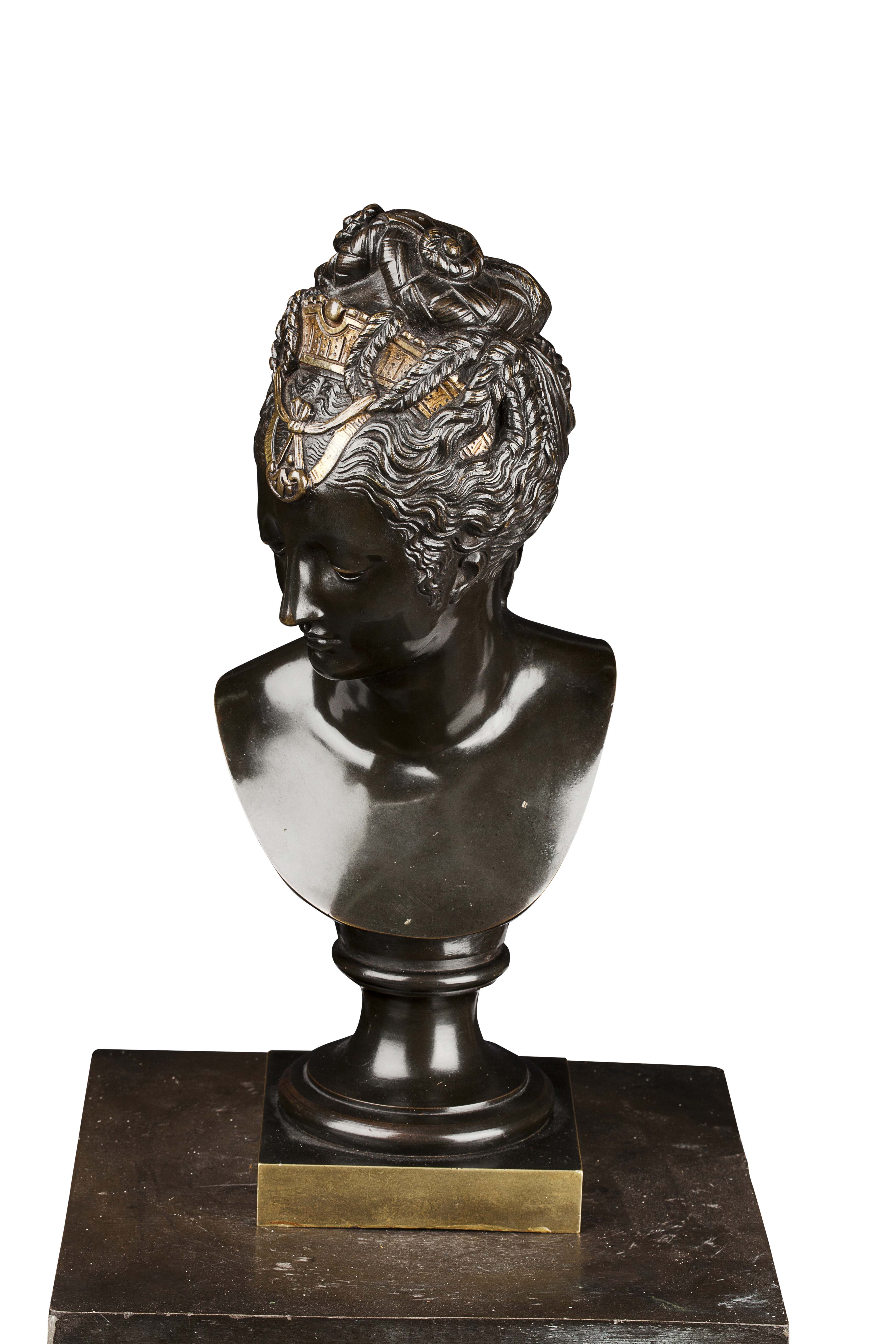 modelled as a Classical maiden, her elaborate headdress with gilt embellishments