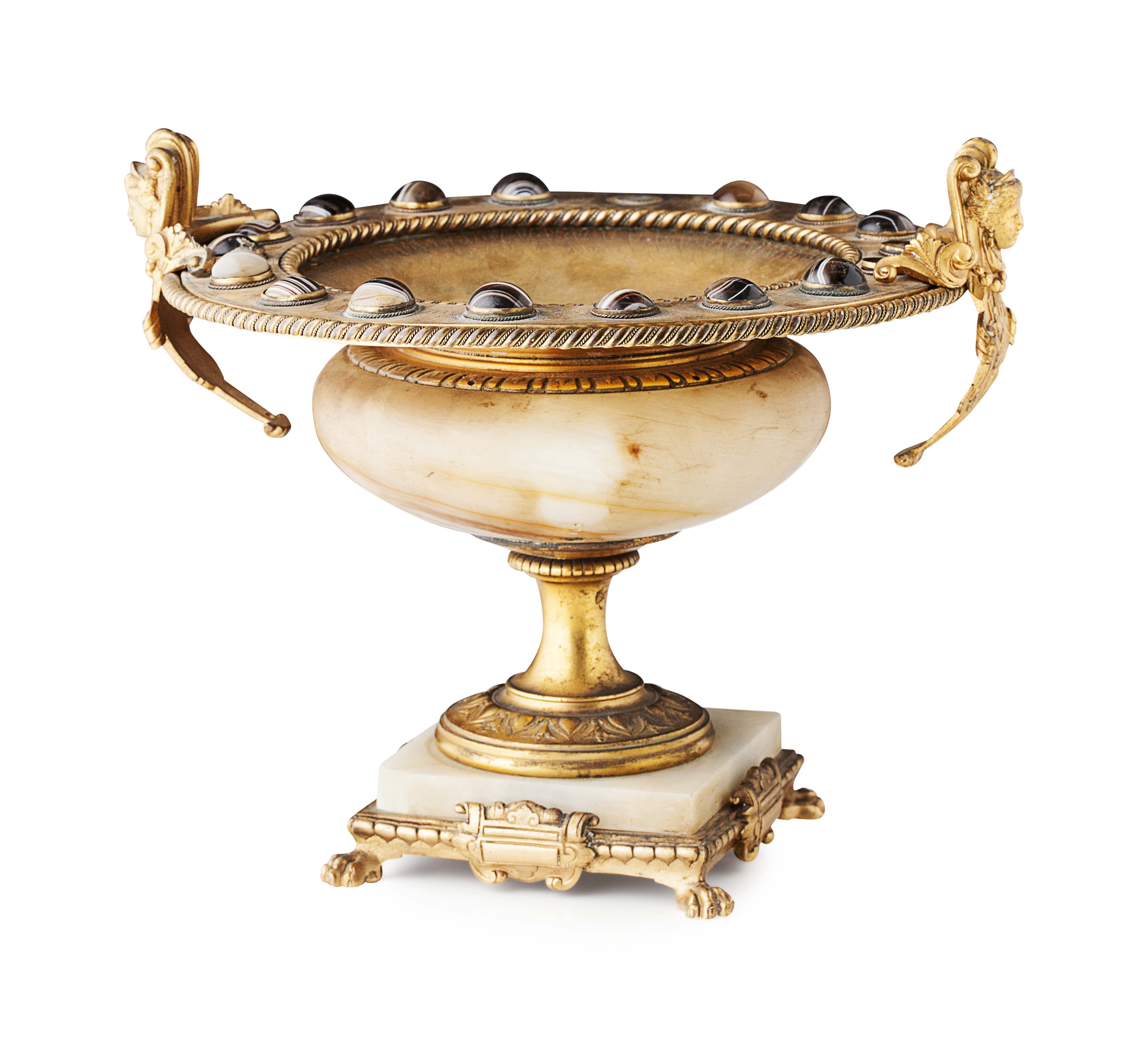 in the Renaissance style, the dished metal top mounted with agate cabochon mounts and later handles, above a white onyx body and square base raised on gilt metal paw feet