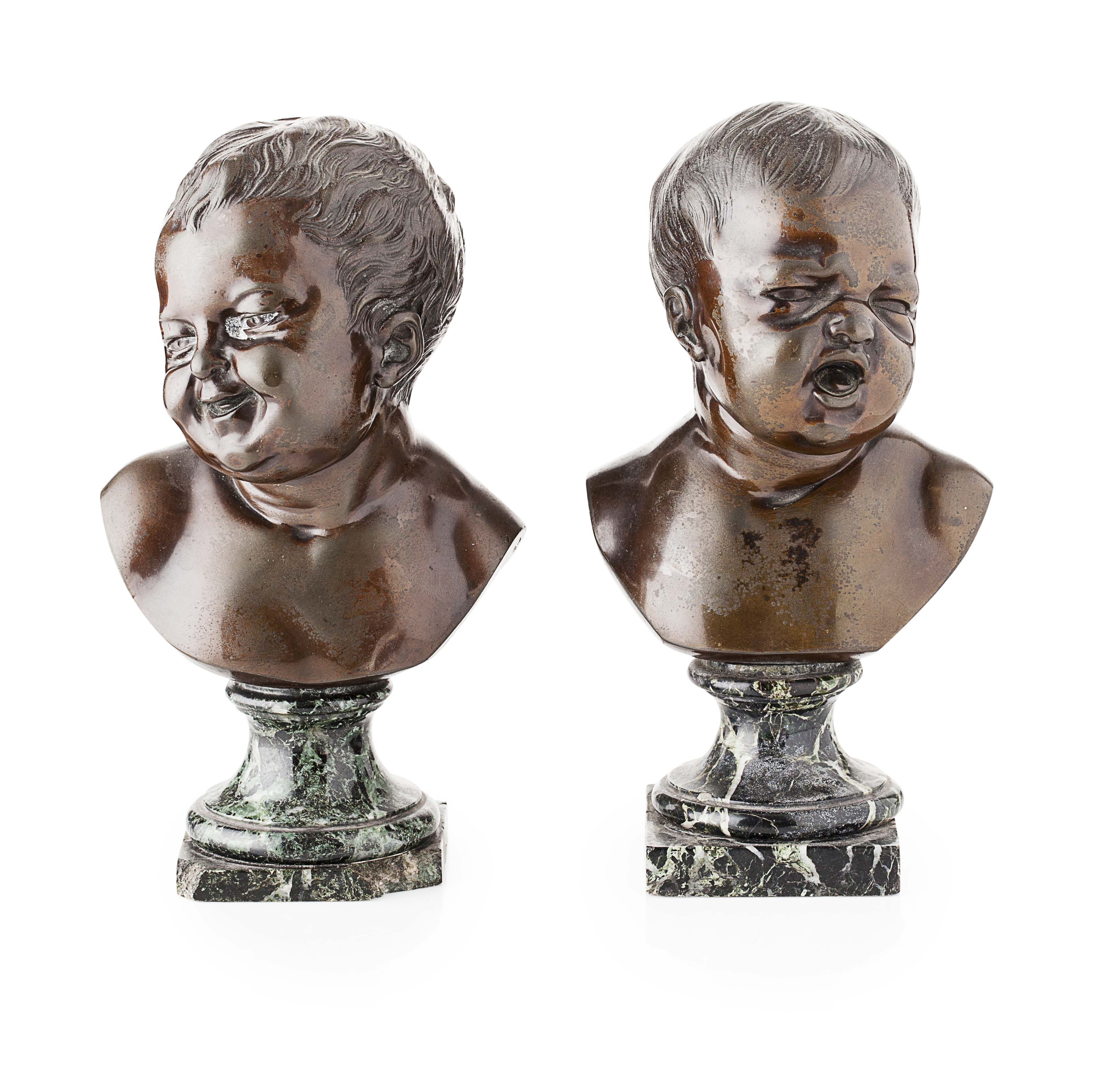 medium brown patina, one modelled as a laughing child, the other crying, on antico verde marble socles and square bases, both bearing Victor Paillard foundry stamps (2)