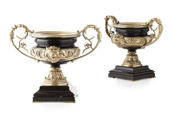 each with a ring turned slate campana body with applied scrolling leaf cast hope centred by lion masks and twin scroll handles, fitted with a bronze liner, on acanthus socle and stepped square base, with brass feet (2)