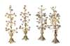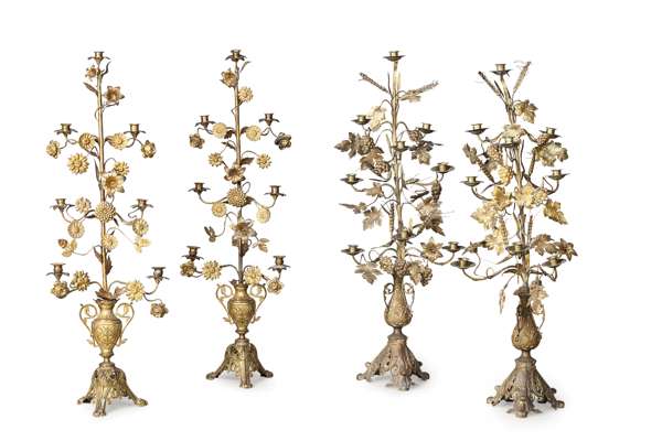 one pair with urns issuing seven scrolling candle arms and flower heads, on triform bases; the other pair with urns issuing seven scrolling candle arms, wheat and grape clusters (4)