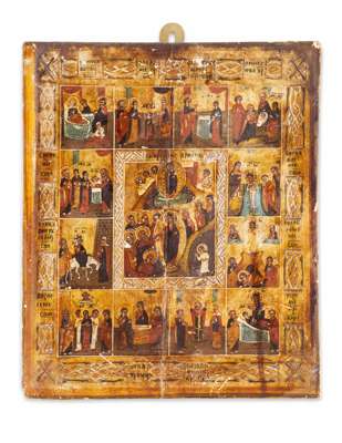 the central panel depicting Christ's descent into Hell and Resurrection, surrounded by twelve liturgical feasts within a border of geometric bands interspersed with text panels, on a gold ground