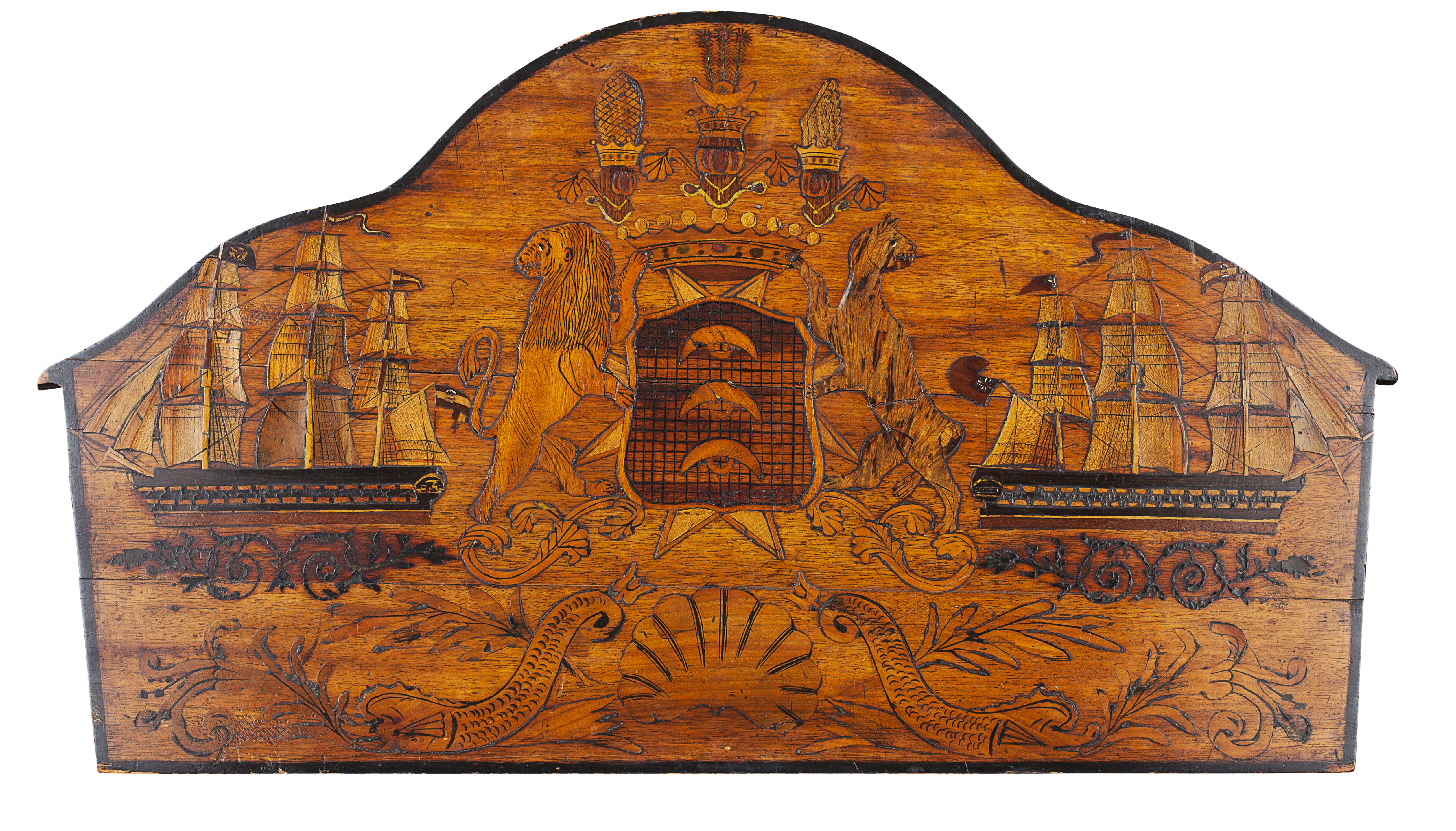 of arched rectangular form, the panel inlaid with a central armorial flanked by two clipper ships