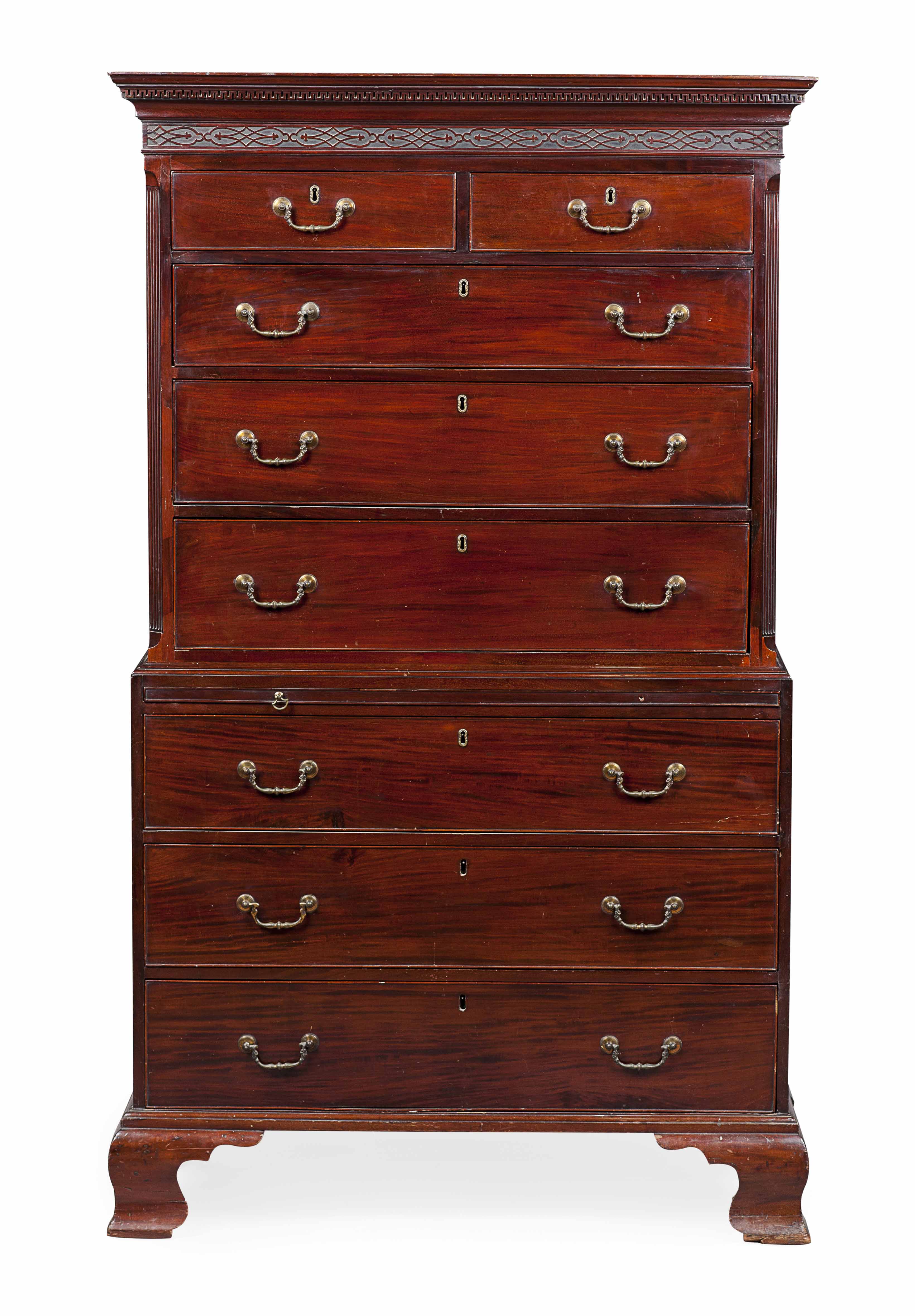 the dentil moulded cornice above a blind fret carved frieze and two short and three long graduated drawers flanked by fluted angles; the lower part with a brushing slide over three further long graduated drawers, raised on ogee bracket feet