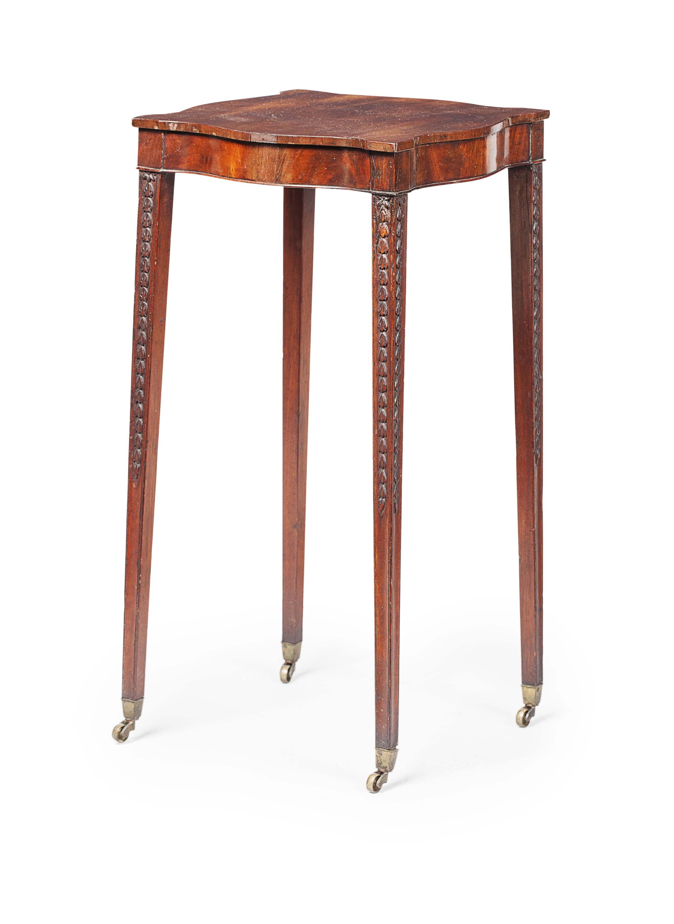 the shaped square top above a serpentine frieze, raised on slender square tapered legs carved with trailing husks ending in brass caps and castors