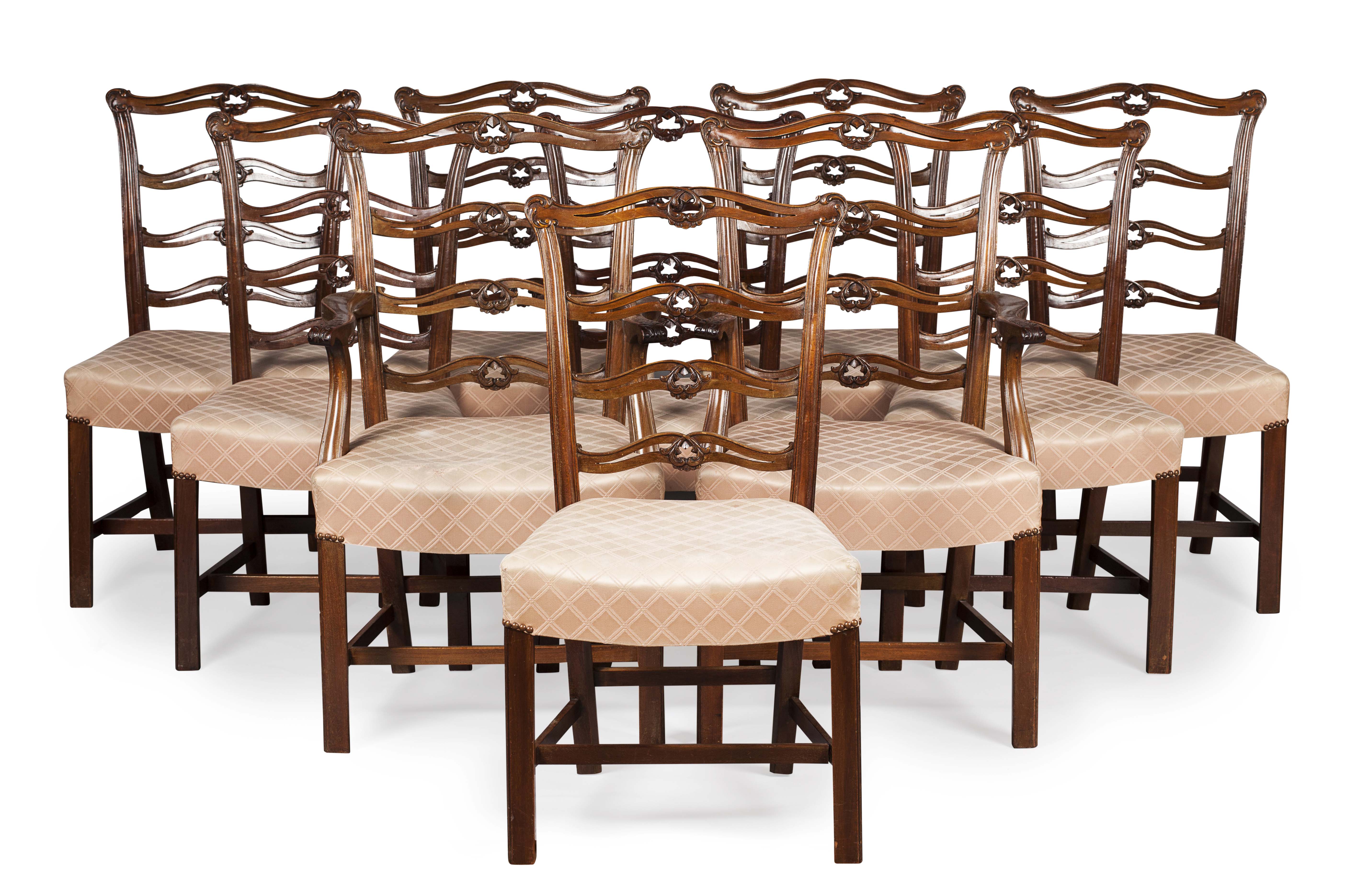 comprising two armchairs and eight side chairs, the serpentine foliate carved and pierced ladderbacks above stuff over seats upholstered in pale pink fabric, raised on square straight legs joined by stretchers (10)
