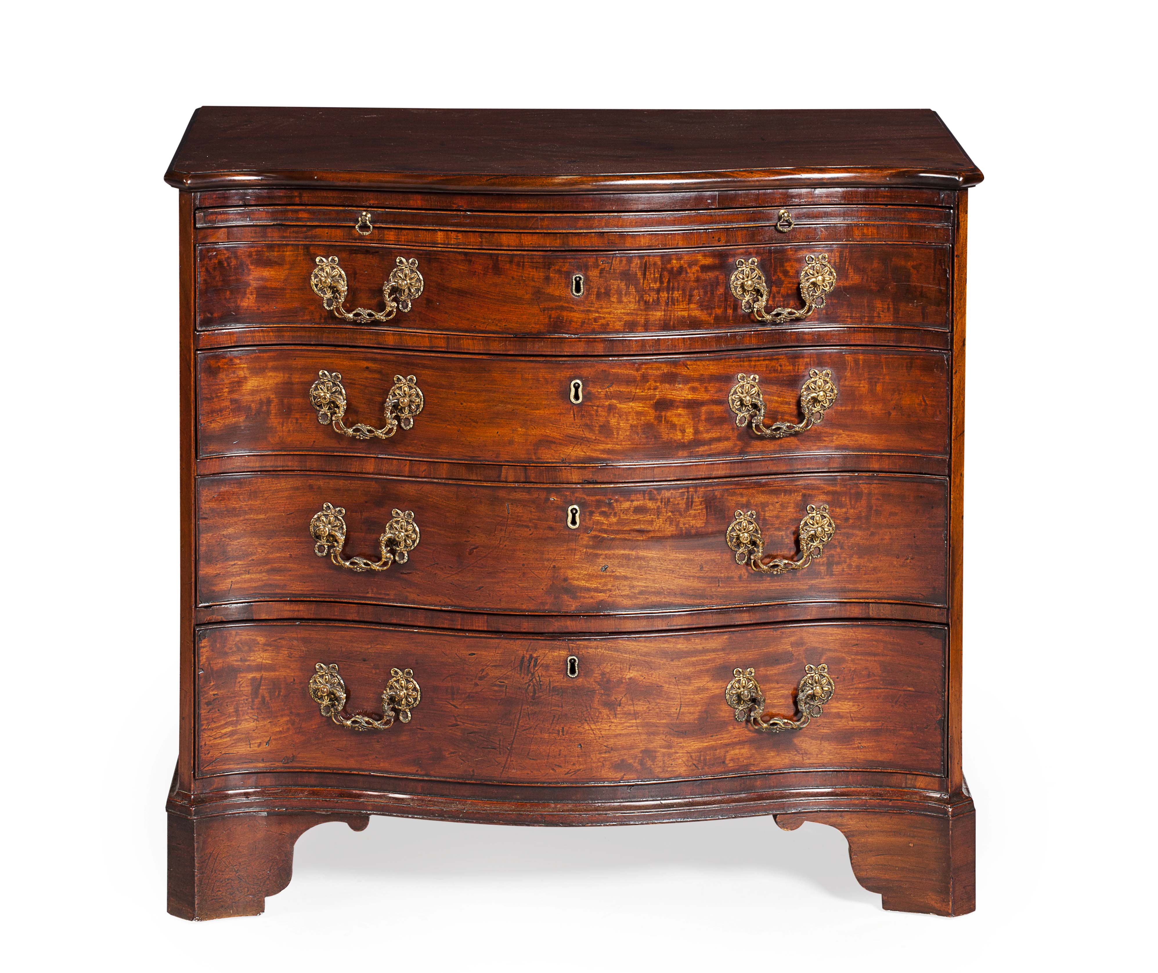of small proportion, the serpentine top with a moulded edge over a brushing slide with a dark blue velvet lining, above four graduated serpentine cockbeaded drawers with entwined vine brass loop handles with ribbon-tied flowerhead backplates, on a moulded base and raised on shaped bracket feet