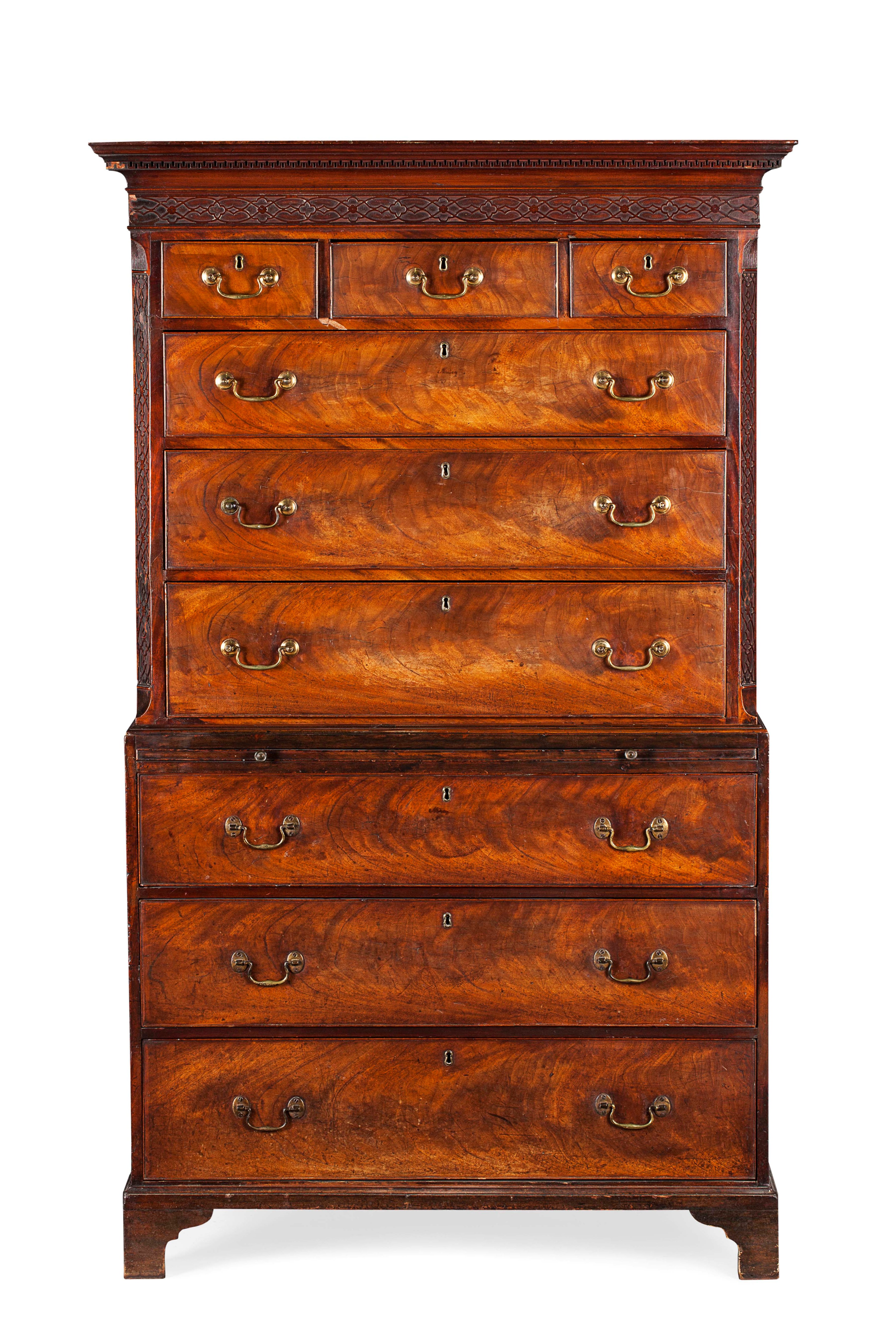 in two parts; the moulded cornice above a key and blind fret carved frieze over three short drawers and three long drawers flanked by fluted angles; the lower part with a brushing slide and three further long drawers, on bracket feet