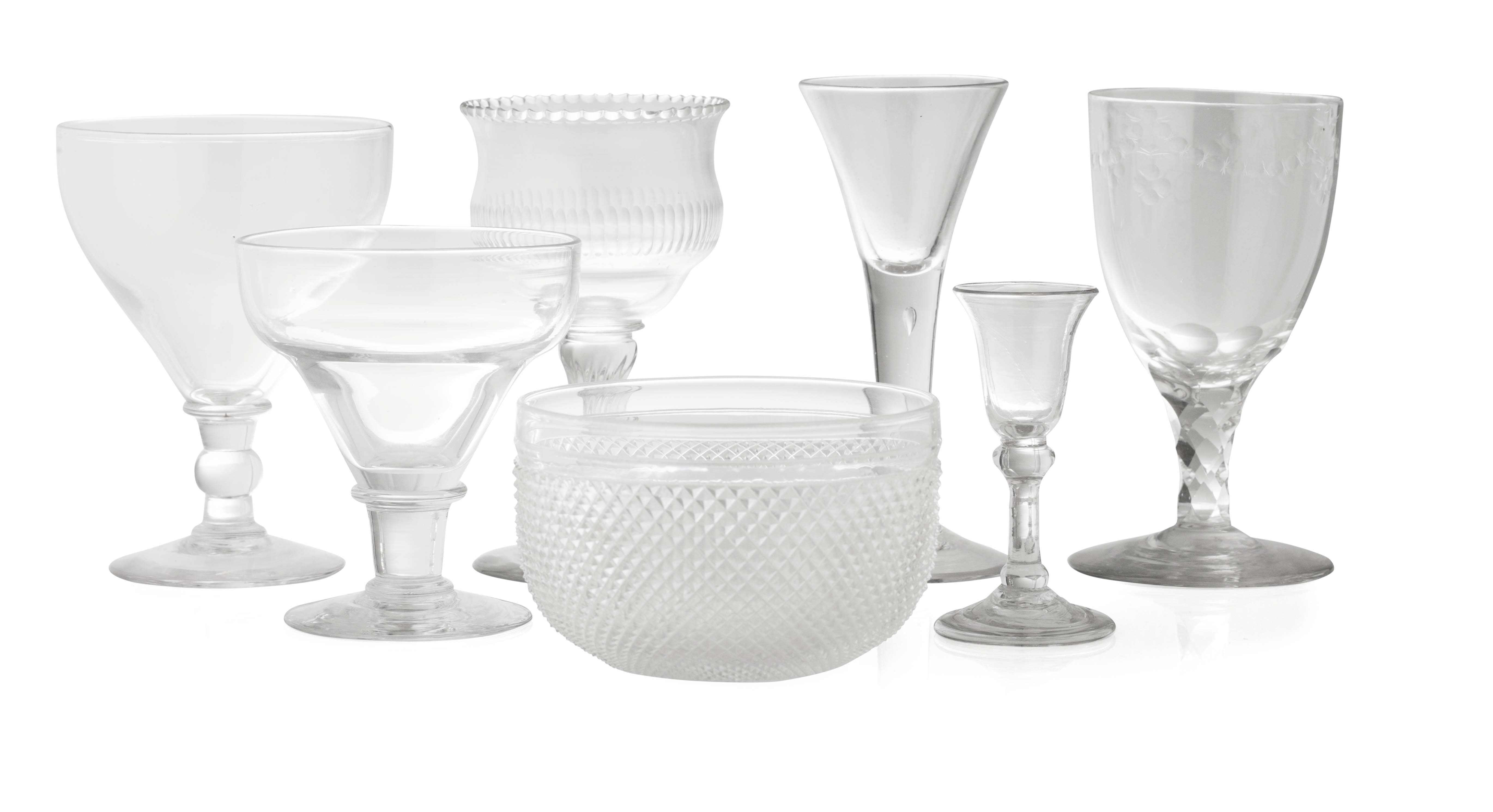 comprising of: a sweetmeat glass, with a cut ogee bowl and waved rim; two rummers, one with a knopped stem; an engraved wine glass with a facet cut stem; a fluted drinking glass; a small toasting glass; and a strawberry cut glass fingerbowl (7)