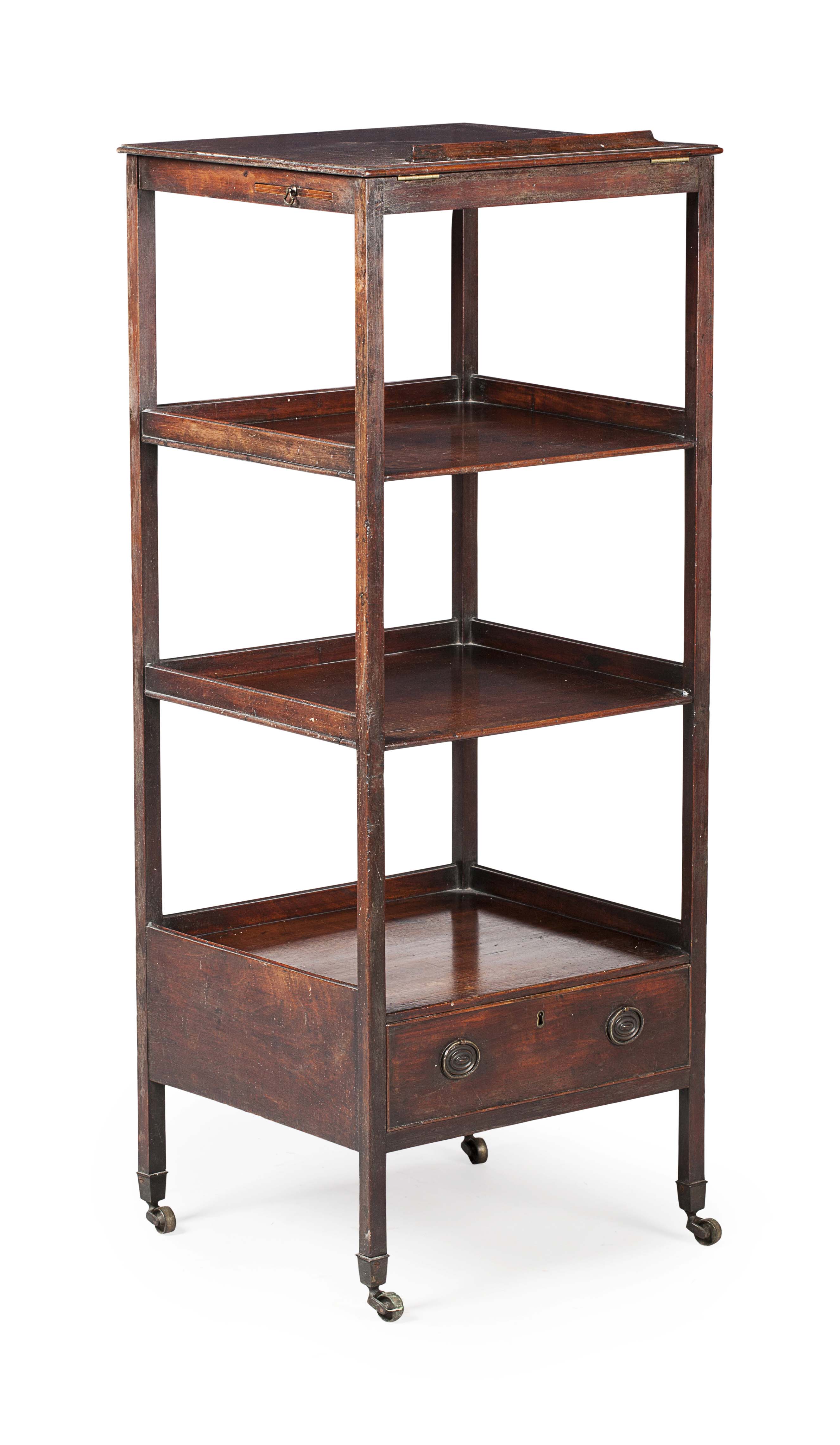 the ratchet adjustable hinged top with a book rest and fitted with a candle slide, above three further tiers with three-quarter galleries, the lower tier with an apron drawer, raised on straight legs with brass caps and castors