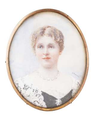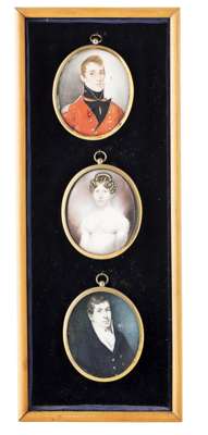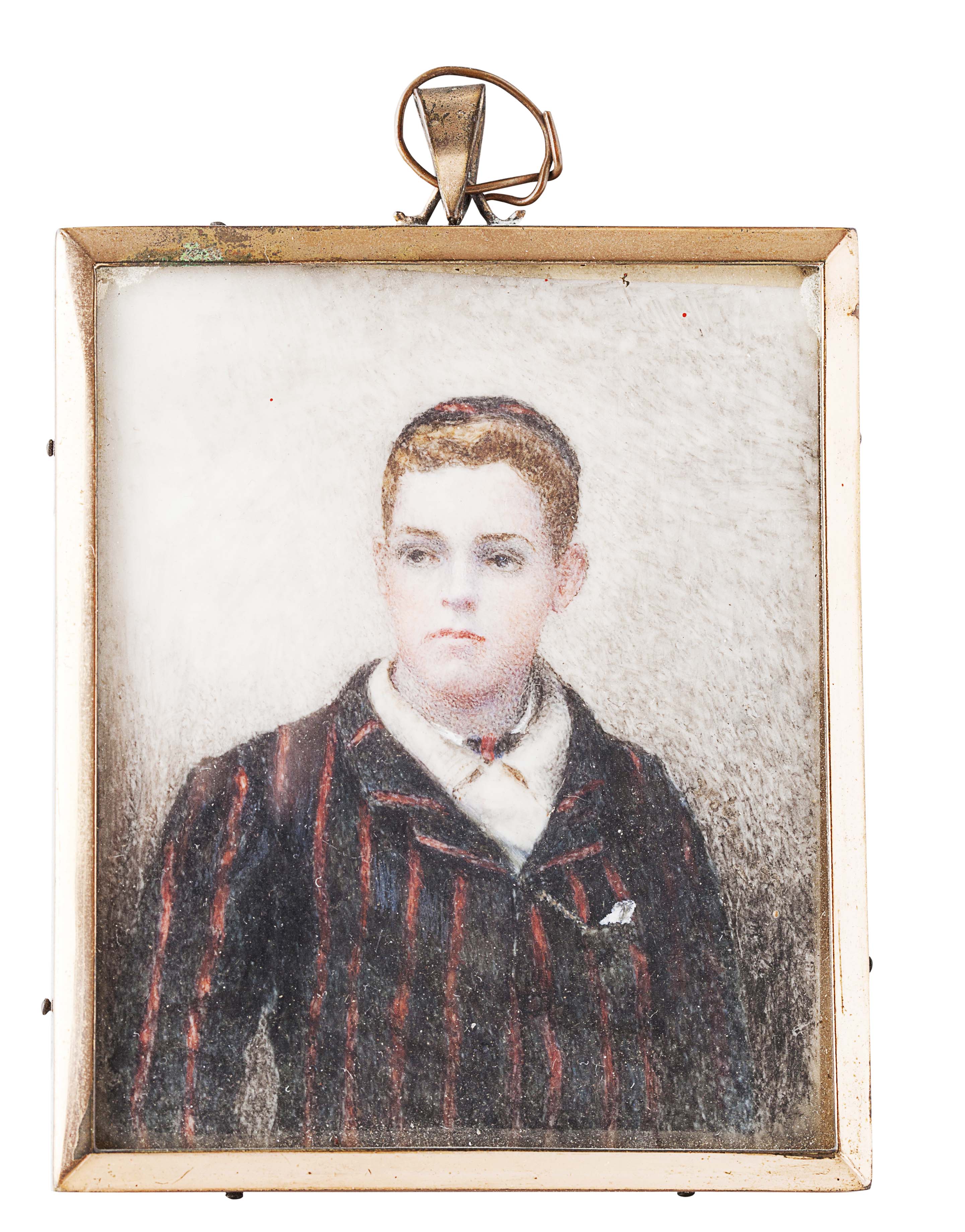 on ivory, depicting a young infantry officer with blonde hair, 7.2cm high; a young woman with blonde hair wearing a white dress, 7.2cm high; and a young man wearing a white cravat with a blue sapphire tie pin, 7cm high; all in gilt brass frames; together with TWO EARLY 20TH CENTURY PORTRAIT MINIATURES, on ivory, comprising an oval portrait of a woman wearing a white lace shawl, and a rectangular portrait of a boy in a striped jacket (5)